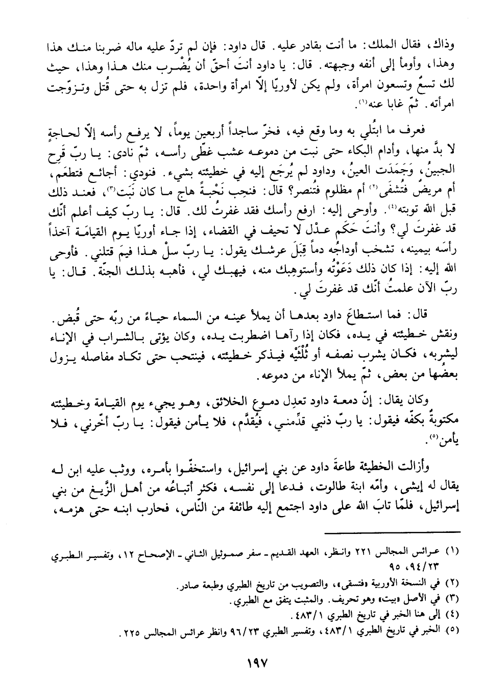 فَعَرَفَ مَا ابْتُلِيَ بِهِ وَمَا وَقَعَ فِيهِ، فَخَرَّ سَاجِدًا أَرْبَعِينَ يَوْمًا لَا يَرْفَعُ رَأْسَهُ إِلَّا لِحَاجَةٍ لَا بُدَّ مِنْهَا، وَأَدَامَ الْبُكَاءَ حَتَّى نَبَتَ مِنْ دُمُوعِهِ عُشْبٌ غَطَّى رَأْسَهُ، ثُمَّ نَادَى: يَا رَبِّ، قَرُحَ الْجَبِينُ، وَجَمُدَتِ الْعَيْنُ، وَدَاوُدُ لَمْ يَرْجِعْ إِلَيْهِ فِي خَطِيئَتِهِ بِشَيْءٍ. فَنُودِيَ: أَجَائِعٌ فَتُطْعَمَ، أَمْ مَرِيضٌ فَتُشْفَى، أَمْ مَظْلُومٌ فَتُنْصَرَ؟ قَالَ: فَنَحِبَ نَحْبَةً هَاجَ مَا نَبَتَ، فَعِنْدَ ذَلِكَ قَبِلَ اللَّهُ تَوْبَتَهُ، وَأَوْحَى إِلَيْهِ: ارْفَعْ رَأْسَكَ فَقَدْ غَفَرْتُ لَكَ. قَالَ: يَا رَبِّ، كَيْفَ أَعْلَمُ أَنَّكَ قَدْ غَفَرْتَ لِي؟ وَأَنْتَ حَكَمٌ عَدْلٌ لَا تَحِيفُ فِي الْقَضَاءِ إِذَا جَاءَ أُورِيَّا يَوْمَ الْقِيَامَةِ آخِذًا رَأْسَهُ بِيَمِينِهِ تَشْخَبُ أَوْدَاجُهُ دَمًا قِبَلَ عَرْشِكَ يَقُولُ: يَا رَبِّ، سَلْ هَذَا فِيمَ قَتَلَنِي. فَأَوْحَى اللَّهُ إِلَيْهِ: إِذَا كَانَ ذَلِكَ دَعَوْتُهُ وَأَسْتَوْهِبُكَ مِنْهُ فَيَهَبُكَ لِي فَأَهَبُهُ بِذَلِكَ الْجَنَّةَ. قَالَ: يَا رَبِّ الْآنَ عَلِمْتُ أَنَّكَ قَدْ غَفَرْتَ لِي.