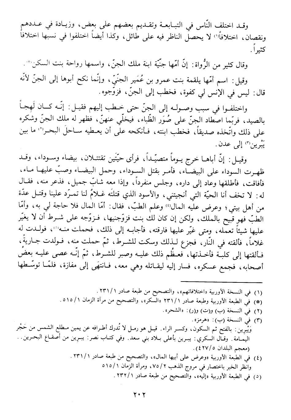 وَاخْتَلَفُوا فِي سَبَبِ وُصُولِهِ إِلَى الْجِنِّ حَتَّى خَطَبَ إِلَيْهِمْ فَقِيلَ: إِنَّهُ كَانَ لَهِجًا بِالصَّيْدِ، فَرُبَّمَا اصْطَادَ الْجِنَّ عَلَى صُوَرِ الظِّبَاءِ فَيُخَلِّي عَنْهُنَّ فَظَهَرَ لَهُ مَلَكُ الْجِنِّ وَشَكَرَهُ عَلَى ذَلِكَ وَاتَّخَذَهُ صَدِيقًا، فَخَطَبَ ابْنَتَهُ، فَأَنْكَحَهُ عَلَى أَنْ يُعْطِيَهُ سَاحِلَ الْبَحْرِ مَا بَيْنَ يَبْرِينَ إِلَى عَدَنَ، وَقِيلَ: إِنَّ أَبَاهَا خَرَجَ يَوْمًا مُتَصَيِّدًا فَرَأَى حَيَّتَيْنِ تَقْتَتِلَانِ بَيْضَاءَ وَسَوْدَاءَ وَقَدْ ظَهَرَتِ السَّوْدَاءُ عَلَى الْبَيْضَاءِ فَأَمَرَ بِقَتْلِ السَّوْدَاءِ، وَحَمَلَ الْبَيْضَاءَ وَصَبَّ عَلَيْهَا الْمَاءَ، فَأَفَاقَتْ، فَأَطْلَقَهَا وَعَادَ إِلَى دَارِهِ وَجَلَسَ مُنْفَرِدًا، وَإِذَا مَعَهُ شَابٌّ جَمِيلٌ، فَذُعِرَ مِنْهُ، فَقَالَ لَهُ: لَا تَخَفْ أَنَا الْحَيَّةُ الَّتِي أَنْجَيْتَنِي، وَالْأَسْوَدُ الَّذِي قَتَلْتَهُ غُلَامٌ لَنَا تَمَرَّدَ عَلَيْنَا وَقَتَلَ عِدَّةً مِنْ أَهْلِ بَيْتِي، وَعَرَضَ عَلَيْهِ الْمَالَ وَعِلْمَ الطِّبِّ، فَقَالَ: أَمَّا الْمَالُ فَلَا حَاجَةَ لِي بِهِ، وَأَمَّا الطِّبُّ فَهُوَ قَبِيحٌ بِالْمَلِكِ، وَلَكِنْ إِنْ كَانَ لَكَ بِنْتٌ فَزَوِّجْنِيهَا، فَزَوَّجَهُ عَلَى شَرْطِ أَنْ لَا يُغَيِّرَ عَلَيْهَا شَيْئًا تَعْمَلُهُ وَمَتَى غَيَّرَ عَلَيْهَا فَارَقَتْهُ، فَأَجَابَهُ إِلَى ذَلِكَ، فَحَمَلَتْ مِنْهُ فَوَلَدَتْ لَهُ غُلَامًا فَأَلْقَتْهُ فِي النَّارِ فَجَزَعَ لِذَلِكَ وَسَكَتَ لِلشَّرْطِ، ثُمَّ حَمَلَتْ مِنْهُ فَوَلَدَتْ جَارِيَةً فَأَلْقَتْهَا إِلَى كَلْبَةٍ فَأَخَذَتْهَا، فَعَظُمَ ذَلِكَ عَلَيْهِ وَصَبَرَ لِلشَّرْطِ، ثُمَّ إِنَّهُ عَصَى عَلَيْهِ بَعْضُ أَصْحَابِهِ فَجَمَعَ عَسْكَرَهُ فَسَارَ إِلَيْهِ لِيُقَاتِلَهُ وَهِيَ مَعَهُ، فَانْتَهَى إِلَى مَفَازَةٍ، فَلَمَّا تَوَسَّطَهَا