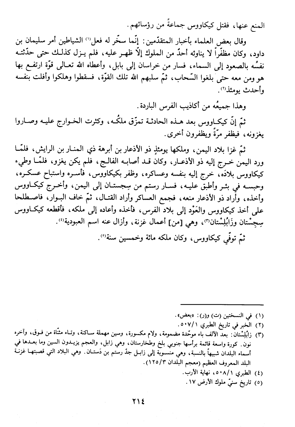 ثُمَّ غَزَا بِلَادَ الْيَمَنِ وَمَلِكُهَا يَوْمَئِذٍ ذُو الْأَذْعَارِ بْنُ أَبَرْهَةَ ذِي الْمَنَارِ بْنِ الرَّايِشِ، فَلَمَّا وَرَدَ الْيَمَنَ خَرَجَ إِلَيْهِ ذُو الْأَذْعَارِ، وَكَانَ قَدْ أَصَابَهُ الْفَالِجُ، فَلَمْ يَكُنْ يَغْزُو، فَلَمَّا وَطِئَ كَيْكَاوُوسُ بِلَادَهُ خَرَجَ إِلَيْهِ بِنَفْسِهِ وَعَسَاكِرِهِ وَظَفِرَ بِكَيْكَاوُوسَ فَأَسَرَهُ وَاسْتَبَاحَ عَسْكَرَهُ، وَحَبَسَهُ فِي بِئْرٍ وَأَطْبَقَ عَلَيْهِ. فَسَارَ رُسْتَمُ مِنْ سِجِسْتَانَ إِلَى الْيَمَنِ وَأَخْرَجَ كَيْكَاوُوسَ وَأَخَذَهُ، وَأَرَادَ ذُو الْأَذْعَارِ مَنْعَهُ فَجَمَعَ الْعَسَاكِرَ وَأَرَادَ الْقِتَالَ ثُمَّ خَافَ الْبَوَارَ فَاصْطَلَحَا عَلَى أَخْذِ كَيْكَاوُوسَ وَالْعَوْدِ إِلَى بِلَادِ الْفُرْسِ، فَأَخَذَهُ وَأَعَادَهُ إِلَى مُلْكِهِ، فَأَقْطَعَهُ كَيْكَاوُوسُ سِجِسْتَانَ وَزَابُلِسْتَانَ، وَهِيَ مِنْ أَعْمَالِ غَزْنَةَ، وَأَزَالَ عَنْهُ اسْمَ الْعُبُودِيَّةِ، ثُمَّ تُوُفِّيَ كَيْكَاوُوسُ، وَكَانَ مُلْكُهُ خَمْسَمِائَةٍ وَخَمْسِينَ سَنَةً.