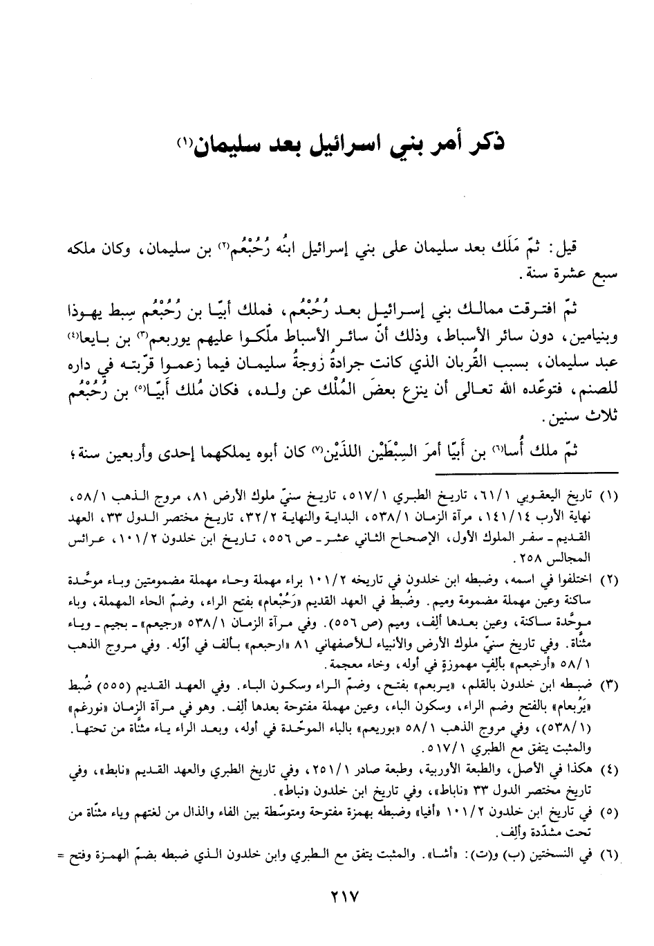 قِيلَ ثُمَّ مَلَكَ بَعْدَ سُلَيْمَانَ عَلَى بَنِي إِسْرَائِيلَ ابْنُهُ رُحُبْعُمُ بْنُ سُلَيْمَانَ وَكَانَ مُلْكُهُ سَبْعَ عَشْرَةَ سَنَةً، ثُمَّ افْتَرَقَتْ مَمَالِكُ بَنِي إِسْرَائِيلَ بَعْدَ رُحُبْعُمَ، فَمَلَكَ أَبِيَّا بْنُ رُحُبْعُمَ سِبْطَ يَهُوذَا وَبِنْيَامِينَ دُونَ سَائِرِ الْأَسْبَاطِ، وَذَلِكَ أَنَّ سَائِرَ الْأَسْبَاطِ مَلَّكُوا عَلَيْهِمْ يُورَبْعَمَ بْنَ بَايِعَا عَبْدَ سُلَيْمَانَ بِسَبَبِ الْقُرْبَانِ الَّذِي كَانَتْ جَرَادَةُ زَوْجَةُ سُلَيْمَانَ فِيمَا زَعَمُوا قَرَّبَتْهُ فِي دَارِهِ لِلصَّنَمِ، فَتَوَعَّدَهُ اللَّهُ تَعَالَى أَنْ يَنْزِعَ بَعْضَ الْمُلْكِ عَنْ وَلَدِهِ، فَكَانَ مُلْكُ أَبِيَّا بْنِ رُحُبْعُمَ ثَلَاثَ سِنِينَ، ثُمَّ مَلَكَ أُسَّا بْنُ أَبِيَّا أَمْرَ السِّبْطَيْنِ اللَّذَيْنِ كَانَ أَبُوهُ يَمْلِكُهُمَا إِحْدَى وَأَرْبَعِينَ سَنَةً،
