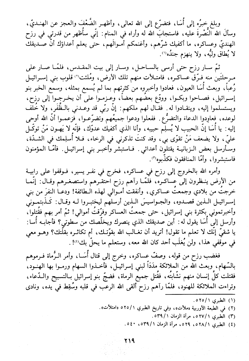 فَغَضِبَ رَزَحُ مِنْ قَوْلِهِ وَصَفَّ عَسَاكِرَهُ وَخَرَجَ إِلَى قِتَالِ أُسَّا وَأَمَرَ الرُّمَاةَ فَرَمَوْهُمْ بِالسِّهَامِ، وَبَعَثَ اللَّهُ مِنَ الْمَلَائِكَةِ مَدَدًا لِبَنِي إِسْرَائِيلَ، فَأَخَذُوا السِّهَامَ وَرَمَوْا بِهَا الْهُنُودَ، فَقَتَلَتْ كُلَّ إِنْسَانٍ مِنْهُمْ نَشَّابَتُهُ، فَقُتِلَ جَمِيعُ الرُّمَاةِ، فَضَجَّ بَنُو إِسْرَائِيلَ بِالتَّسْبِيحِ وَالدُّعَاءِ، وَتَرَاءَتِ الْمَلَائِكَةُ لِلْهُنُودِ، فَلَمَّا رَآهُمْ رَزَحُ أَلْقَى اللَّهُ الرُّعْبَ فِي قَلْبِهِ وَسُقِطَ فِي يَدِهِ وَنَادَى