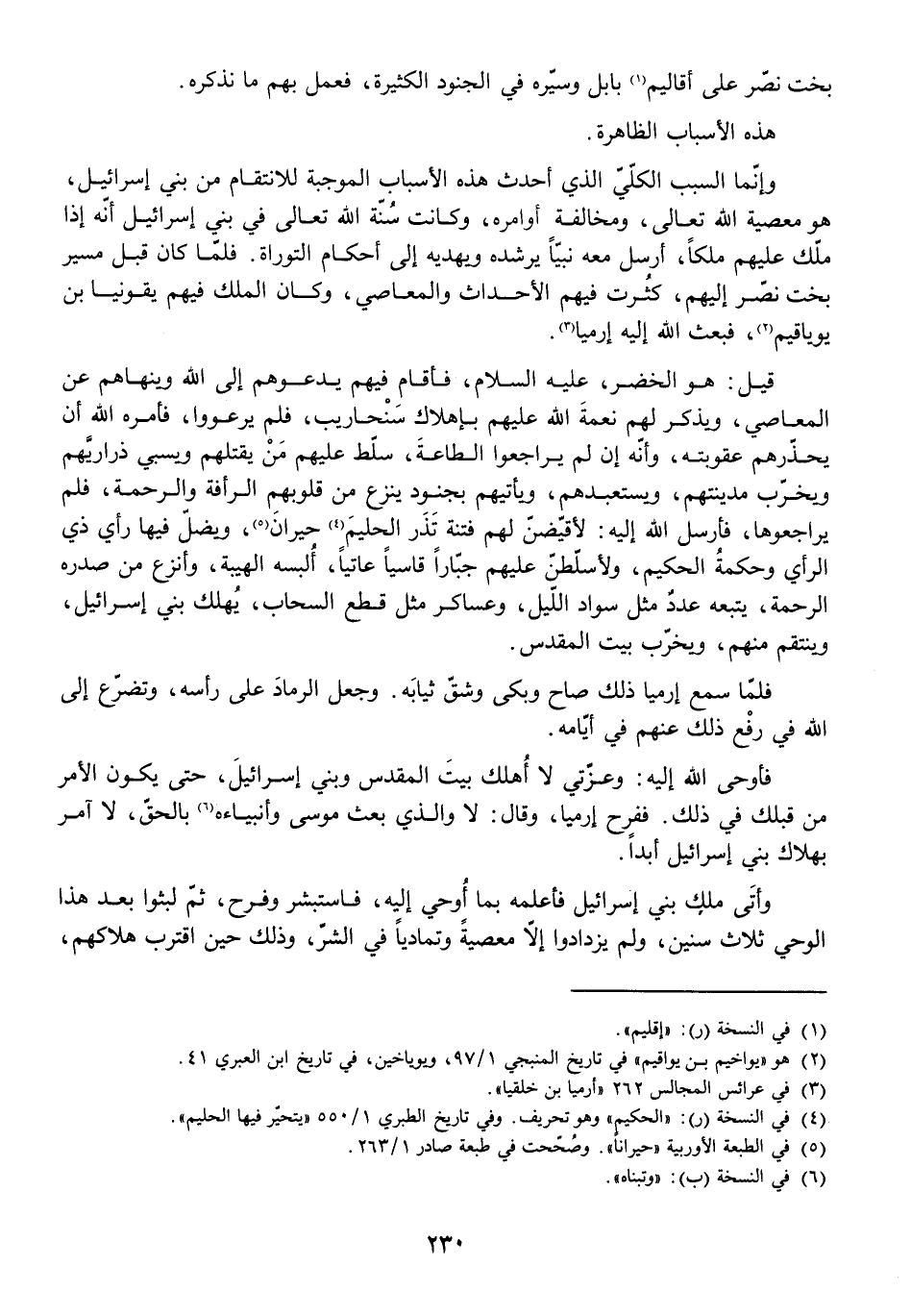 هَذِهِ الْأَسْبَابُ الظَّاهِرَةُ، وَإِنَّمَا السَّبَبُ الْكُلِّيُّ الَّذِي أَحْدَثَ هَذِهِ الْأَسْبَابَ الْمُوجِبَةَ لِلِانْتِقَامِ مِنْ بَنِي إِسْرَائِيلَ هُوَ مَعْصِيَةُ اللَّهِ تَعَالَى وَمُخَالَفَةُ أَوَامِرِهِ، وَكَانَتْ سُنَّةُ اللَّهِ تَعَالَى فِي بَنِي إِسْرَائِيلَ أَنَّهُ إِذَا مَلَّكَ عَلَيْهِمْ مَلِكًا أَرْسَلَ مَعَهُ نَبِيًّا يُرْشِدُهُ وَيَهْدِيهِ إِلَى أَحْكَامِ التَّوْرَاةِ. فَلَمَّا كَانَ قَبْلَ مَسِيرِ بُخْتُنَصَّرَ إِلَيْهِمْ كَثُرَتْ فِيهِمُ الْأَحْدَاثُ وَالْمَعَاصِي، وَكَانَ الْمَلِكُ فِيهِمْ يَقُونِيَا بْنُ يُويَاقِيمَ، فَبَعَثَ اللَّهُ إِلَيْهِ إِرْمِيَا، قِيلَ: هُوَ الْخَضِرُ - عَلَيْهِ السَّلَامُ - فَأَقَامَ فِيهِمْ يَدْعُوهُمْ إِلَى اللَّهِ وَيَنْهَاهُمْ عَنِ الْمَعَاصِي وَيَذْكُرُ لَهُمْ نِعْمَةَ اللَّهِ عَلَيْهِمْ بِإِهْلَاكِ سَنْحَارِيبَ، فَلَمْ يَرْعَوُوا، فَأَمَرَهُ اللَّهُ أَنْ يُحَذِّرَهُمْ عُقُوبَتَهُ وَأَنَّهُ إِنْ لَمْ يُرَاجِعُوا الطَّاعَةَ سَلَّطَ عَلَيْهِمْ مَنْ يَقْتُلُهُمْ وَيَسْبِي ذَرَارِيَّهُمْ وَيُخَرِّبُ مَدْيَنَتَهُمْ، وَيَسْتَعْبِدُهُمْ وَيَأْتِيهِمْ بِجُنُودٍ يَنْزِعُ مِنْ قُلُوبِهِمُ الرَّأْفَةَ وَالرَّحْمَةَ، فَلَمْ يُرَاجِعُوهَا، فَأَرْسَلَ اللَّهُ إِلَيْهِ: لَأُقَيِّضَنَّ لَهُمْ فِتْنَةً تَذَرُ الْحَلِيمَ حَيْرَانَ فِيهَا وَيَضِلُّ فِيهَا رَأْيُ ذِي الرَّأْي، وَحِكْمَةُ الْحَكِيمِ، وَلَأُسَلِّطَنَّ عَلَيْهِمْ جَبَّارًا قَاسِيًا عَاتِبًا أُلْبِسُهُ الْهَيْبَةَ وَأَنْزِعُ مِنْ صَدْرِهِ الرَّحْمَةَ، يَتْبَعُهُ عَدَدٌ مِثْلُ سَوَادِ اللَّيْلِ، وَعَسَاكِرُ مِثْلُ قِطَعِ السَّحَابِ، يُهْلِكُ بَنِي إِسْرَائِيلَ وَيَنْتَقِمُ مِنْهُمْ وَيُخَرِّبُ بَيْتَ الْمَقْدِسِ.