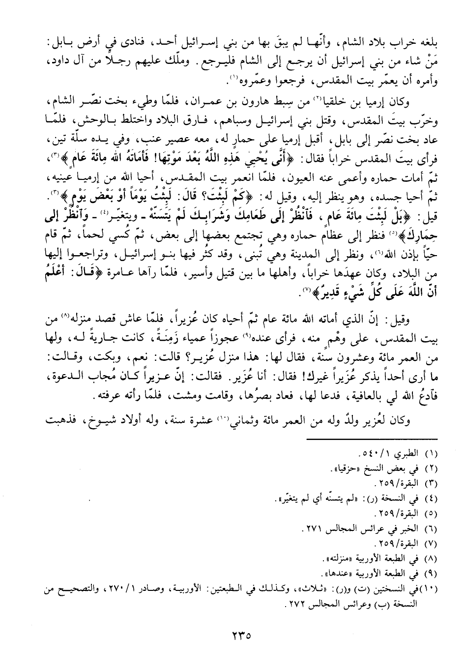 وَكَانَ إِرْمِيَا بْنُ خِلْقِيَا مِنْ سِبْطِ هَارُونَ بْنِ عِمْرَانَ، فَلَمَّا وَطِئَ بُخْتُنَصَّرُ الشَّامَ وَخَرَّبَ بَيْتَ الْمَقْدِسِ وَقَتَلَ بَنِي إِسْرَائِيلَ وَسَبَاهُمْ، فَارَقَ الْبِلَادَ وَاخْتَلَطَ بِالْوَحْشِ، فَلَمَّا عَادَ بُخْتُنَصَّرُ إِلَى بَابِلَ أَقْبَلَ إِرْمِيَا عَلَى حِمَارٍ لَهُ مَعَهُ عَصِيرُ عِنَبٍ وَفِي يَدِهِ سَلَّةُ تِينٍ فَرَأَى بَيْتَ الْمَقْدِسِ خَرَابًا، فَقَالَ: {أَنَّى يُحْيِي هَذِهِ اللَّهُ بَعْدَ مَوْتِهَا فَأَمَاتَهُ اللَّهُ مِائَةَ عَامٍ} [البقرة: 259] ثُمَّ أَمَاتَ حِمَارَهُ، وَأَعْمَى عَنْهُ الْعُيُونَ، فَلَمَّا انْعَمَرَ بَيْتُ الْمَقْدِسِ أَحْيَا اللَّهُ مِنْ إِرْمِيَا عَيْنَيْهِ، ثُمَّ أَحْيَا جَسَدَهُ، وَهُوَ يَنْظُرُ إِلَيْهِ، وَقِيلَ لَهُ: {كَمْ لَبِثْتَ قَالَ لَبِثْتُ يَوْمًا أَوْ بَعْضَ يَوْمٍ} [البقرة: 259] . قِيلَ: {بَلْ لَبِثْتَ مِائَةَ عَامٍ فَانْظُرْ إِلَى طَعَامِكَ وَشَرَابِكَ لَمْ يَتَسَنَّهْ} [البقرة: 259]- وَيَتَغَيَّرُ {وَانْظُرْ إِلَى حِمَارِكَ} [البقرة: 259] فَنَظَرَ إِلَى عِظَامِ حِمَارِهِ وَهِيَ تَجْتَمِعُ بَعْضُهَا إِلَى بَعْضٍ، ثُمَّ كُسِيَ لَحْمًا، ثُمَّ قَامَ حَيًّا بِإِذْنِ اللَّهِ، وَنَظَرَ إِلَى الْمَدِينَةِ وَهِيَ تُبْنَى، وَقَدْ كَثُرَ فِيهَا بَنُو إِسْرَائِيلَ وَتَرَاجَعُوا إِلَيْهَا مِنَ الْبِلَادِ، وَكَانَ عَهْدُهُمْ خَرَابًا، وَأَهْلُهَا مَا بَيْنَ قَتِيلٍ وَأَسِيرٍ، فَلَمَّا رَآهَا عَامِرَةً {قَالَ أَعْلَمُ أَنَّ اللَّهَ عَلَى كُلِّ شَيْءٍ قَدِيرٌ} [البقرة: 259] .