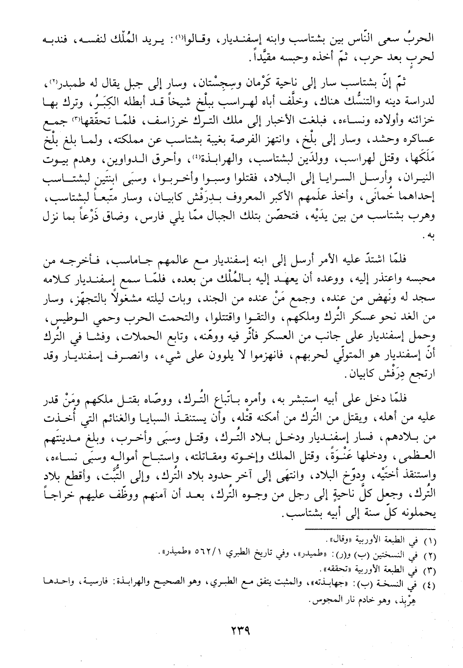 فَلَمَّا اشْتَدَّ عَلَيْهِ الْأَمْرُ أَرْسَلَ إِلَى ابْنِهِ إِسْفِنْدِيَارَ مَعَ عَالِمِهِمْ جَامَاسِبَ، فَأَخْرَجَهُ مِنْ مَحْبِسِهِ وَاعْتَذَرَ إِلَيْهِ وَوَعَدَهُ أَنْ يَعْهَدَ إِلَيْهِ بِالْمُلْكِ مِنْ بَعْدِهِ، فَلَمَّا سَمِعَ إِسْفِنْدِيَارُ كَلَامَهُ سَجَدَ لَهُ وَنَهَضَ مِنْ عِنْدِهِ وَجَمَعَ مَنْ عِنْدَهُ مِنَ الْجُنْدِ وَبَاتَ لَيْلَتَهُ مَشْغُولًا بِالتَّجَهُّزِ وَسَارَ مِنَ الْغَدِ نَحْوَ عَسْكَرِ التُّرْكِ وَمَلِكِهِمْ، وَالْتَقَوْا، وَاقْتَتَلُوا، وَالْتَحَمَتِ الْحَرْبُ، وَحَمِيَ الْوَطِيسُ، وَحَمَلَ إِسْفِنْدِيَارُ عَلَى جَانِبٍ مِنَ الْعَسْكَرِ فَأَثَّرَ فِيهِ وَوَهَنَهُ وَتَابَعَ الْحَمَلَاتِ، وَفَشَا فِي التُّرْكِ أَنَّ إِسْفِنْدِيَارَ هُوَ الْمُتَوَلِّي لِحَرْبِهِمْ، فَانْهَزَمُوا لَا يَلْوُونَ عَلَى شَيْءٍ، وَانْصَرَفَ إِسْفِنْدِيَارُ وَقَدِ ارْتَجَعَ دِرَفْشَ كَابِيَانَ.