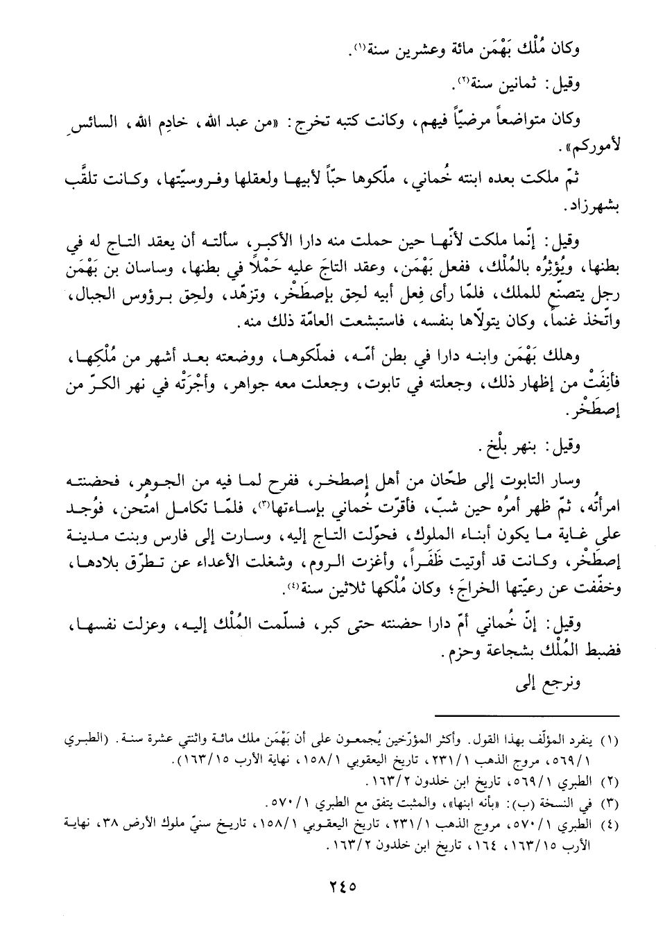 وَسَارَ التَّابُوتُ إِلَى طَحَّانٍ مِنْ أَهْلِ إِصْطَخْرَ، فَفَرِحَ لِمَا فِيهِ مِنَ الْجَوَاهِرِ، فَحَضَنَتْهُ امْرَأَتُهُ، ثُمَّ ظَهَرَ أَمْرُهُ حِينَ شَبَّ، فَأَقَرَّتْ خُمَانَى بِإِسَاءَتِهَا، فَلَمَّا تَكَامَلَ امْتُحِنَ فَوُجِدَ عَلَى غَايَةِ مَا يَكُونُ أَبْنَاءُ الْمُلُوكِ، فَحَوَّلَتِ التَّاجَ إِلَيْهِ وَسَارَتْ إِلَى فَارِسَ وَبَنَتْ مَدِينَةَ إِصْطَخْرَ، وَكَانَتْ قَدْ أُوتِيَتْ ظَفَرًا وَأَغْزَتِ الرُّومَ وَشَغَلَتِ الْأَعْدَاءَ مِنْ تَطَرُّقِ بِلَادِهَا، وَخَفَّفَتْ عَنْ رَعِيَّتِهَا الْخَرَاجَ، وَكَانَ مُلْكُهَا ثَلَاثِينَ سَنَةً.