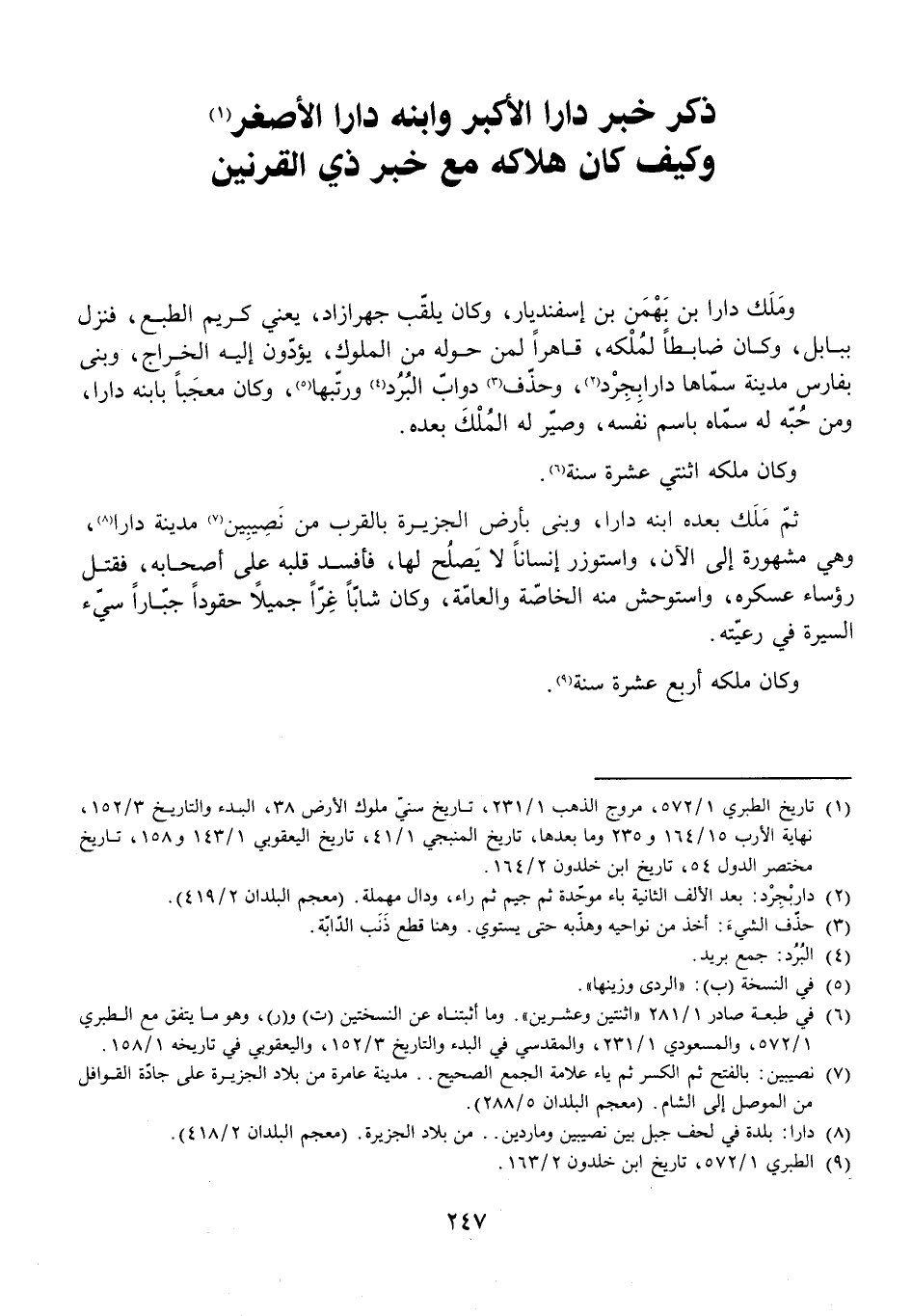 [ذِكْرُ خَبَرِ دَارَا الْأَكْبَرِ وَابْنِهِ دَارَا الْأَصْغَرِ وَكَيْفَ كَانَ هَلَاكُهُ مَعَ خَبَرِ ذِي الْقَرْنَيْنِ]