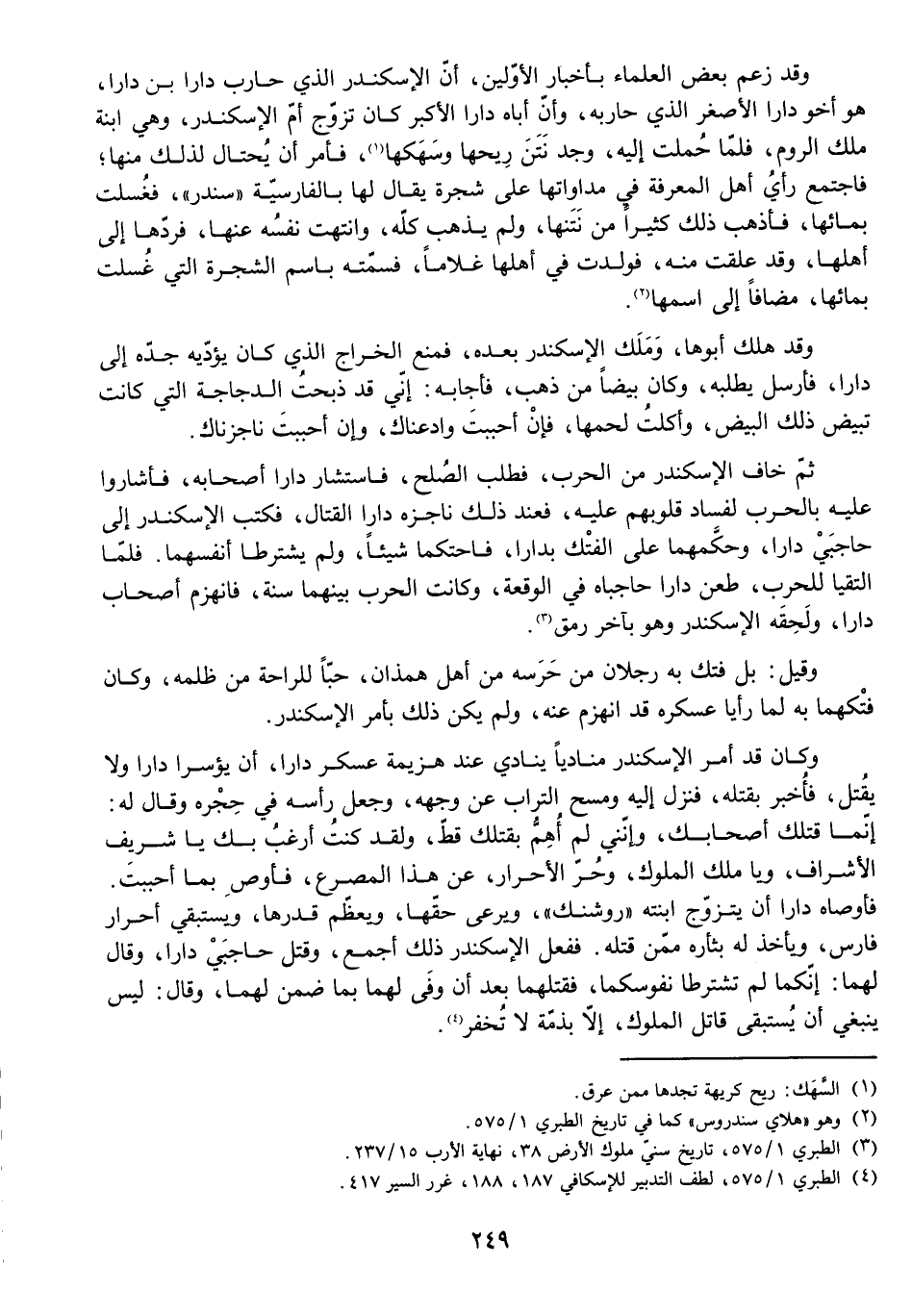 وَقَدْ زَعَمَ بَعْضُ الْعُلَمَاءِ بِأَخْبَارِ الْأَوَّلِينَ أَنَّ الْإِسْكَنْدَرَ الَّذِي حَارَبَ دَارَا بْنَ دَارَا هُوَ أَخُو دَارَا الْأَصْغَرُ الَّذِي حَارَبَهُ، وَأَنَّ أَبَاهُ دَارَا الْأَكْبَرَ كَانَ تَزَوَّجَ أُمَّ الْإِسْكَنْدَرِ، وَهِيَ ابْنَةُ مَلِكِ الرُّومِ، فَلَمَّا حُمِلَتْ إِلَيْهِ وَجَدَ نَتَنَ رِيحَهَا وَسَهَكَهَا، فَأَمَرَ أَنْ يُحْتَالَ لِذَلِكَ مِنْهَا، فَاجْتَمَعَ رَأْيُ أَهْلِ الْمَعْرِفَةِ فِي مُدَاوَاتِهَا عَلَى شَجَرَةٍ يُقَالُ لَهَا بِالْفَارِسِيَّةِ سَنْدَرُ، فَغُسِلَتْ بِمَائِهَا فَأَذْهَبَ ذَلِكَ كَثِيرًا مِنْ نَتَنِهَا وَلَمْ يَذْهَبْ كُلُّهُ، وَانْتَهَتْ نَفْسُهُ عَنْهَا، فَرَدَّهَا إِلَى أَهْلِهَا، وَقَدْ عَلِقَتْ مِنْهُ فَوَلَدَتْ عِنْدَ أَهْلِهَا غُلَامًا فَسَمَّتْهُ بِاسْمِ الشَّجَرَةِ الَّتِي غُسِلَتْ بِمَائِهَا مُضَافًا إِلَى اسْمِهَا.
