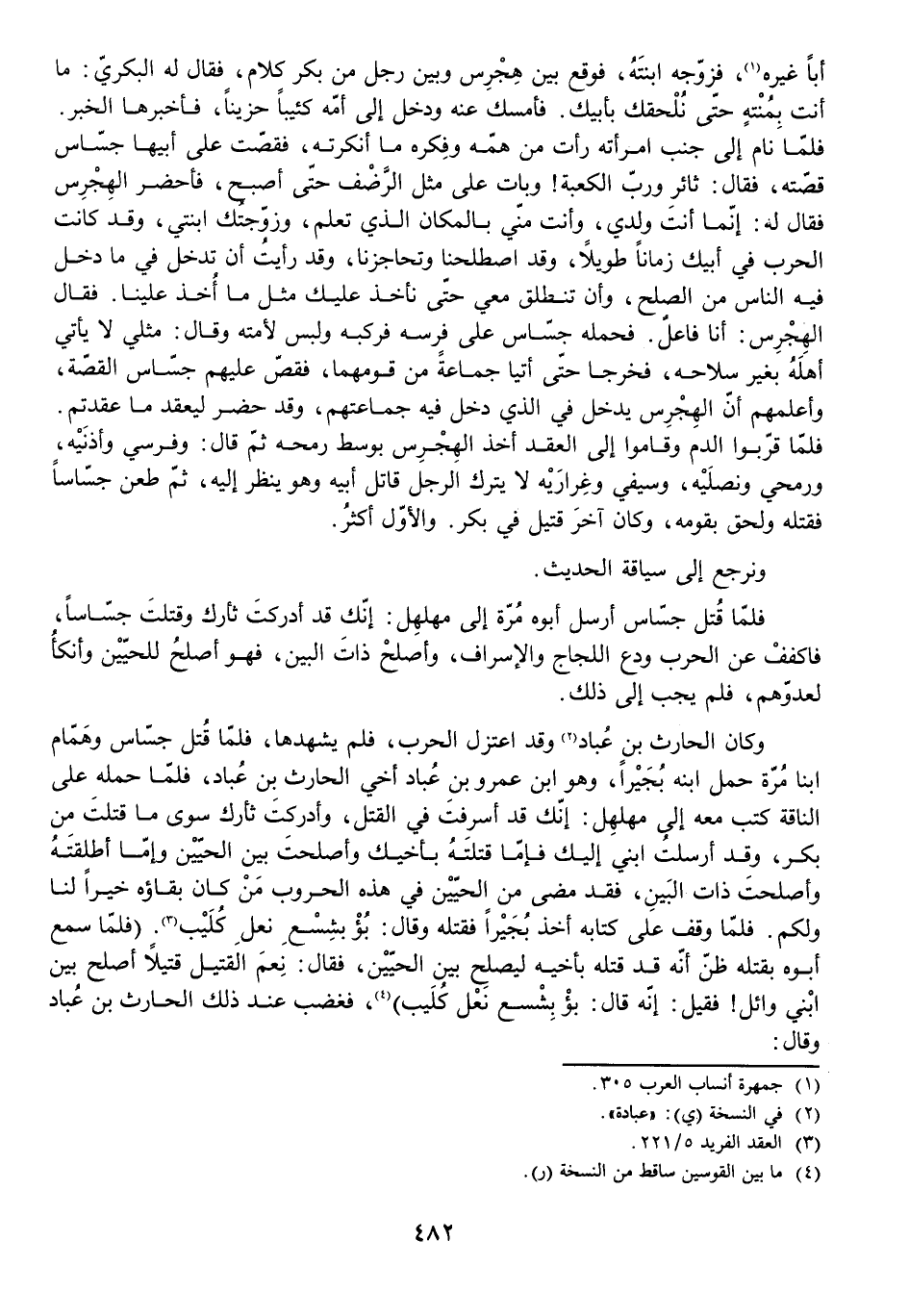 أَبًا غَيْرَهُ، فَزَوَّجَهُ ابْنَتَهُ فَوَقَعَ بَيْنَ هِجْرِسَ وَبَيْنَ رَجُلٍ مِنْ بَكْرٍ كَلَامٌ، فَقَالَ لَهُ الْبَكْرِيُّ: مَا أَنْتَ بِمُنْتَهٍ حَتَّى نُلْحِقَكَ بِأَبِيكَ. فَأَمْسَكَ عَنْهُ وَدَخَلَ إِلَى أُمِّهِ كَئِيبًا حَزِينًا فَأَخْبَرَهَا الْخَبَرَ. فَلَمَّا نَامَ إِلَى جَنْبِ امْرَأَتِهِ رَأَتْ مِنْ هَمِّهِ وَفِكْرِهِ مَا أَنْكَرَتْهُ، فَقَصَّتْ عَلَى أَبِيهَا جَسَّاسٍ قِصَّتَهُ، فَقَالَ: ثَائِرٌ وَرَبِّ الْكَعْبَةِ! وَبَاتَ عَلَى مِثْلِ الرَّضْفِ حَتَّى أَصْبَحَ، فَأَحْضَرَ الْهِجْرِسَ فَقَالَ لَهُ: إِنَّمَا أَنْتَ وَلَدِي وَأَنْتَ مِنِّي بِالْمَكَانِ الَّذِي تَعَلَمُ، وَزَوَّجْتُكَ ابْنَتِي، وَقَدْ كَانَتِ الْحَرْبُ فِي أَبِيكَ زَمَانًا طَوِيلًا، وَقَدِ اصْطَلَحْنَا وَتَحَاجَزْنَا، وَقَدْ رَأَيْتُ أَنْ تَدْخُلَ فِي مَا دَخَلَ فِيهِ النَّاسُ مِنَ الصُّلْحِ، وَأَنْ تَنْطَلِقَ مَعِي حَتَّى نَأْخُذَ عَلَيْكَ مِثْلَ مَا أُخِذَ عَلَيْنَا. فَقَالَ الْهِجْرِسُ: أَنَا فَاعِلٌ. فَحَمَلَهُ جَسَّاسٌ عَلَى فَرَسٍ فَرَكِبَهُ وَلَبِسَ لَأْمَتَهُ وَقَالَ: مِثْلِي لَا يَأْتِي أَهْلَهُ بِغَيْرِ سِلَاحِهِ، فَخَرَجَا حَتَّى أَتَيَا جَمَاعَةً مِنْ قَوْمِهِمَا، فَقَصَّ عَلَيْهِمْ جَسَّاسٌ الْقِصَّةَ، وَأَعْلَمَهُمْ أَنَّ الْهِجْرِسَ يَدْخُلُ فِي الَّذِي دَخَلَ فِيهِ جَمَاعَتُهُمْ وَقَدْ حَضَرَ لِيَعْقِدَ مَا عَقَدْتُمْ. فَلَمَّا قَرَّبُوا الدَّمَ وَقَامُوا إِلَى الْعَقْدِ أَخَذَ الْهِجْرِسُ بِوَسَطِ رُمْحِهِ ثُمَّ قَالَ: وَفَرَسِي وَأُذُنَيْهِ، وَرُمْحِي وَنَصْلَيْهِ، وَسَيْفِي وَغِرَارَيْهِ لَا يَتْرُكُ الرَّجُلُ قَاتِلَ أَبِيهِ وَهُوَ يَنْظُرُ إِلَيْهِ، ثُمَّ طَعَنَ جَسَّاسًا فَقَتَلَهُ وَلَحِقَ بِقَوْمِهِ، وَكَانَ آخِرَ قَتِيلٍ فِي بَكْرٍ. وَالْأَوَّلُ أَكْثَرُ.