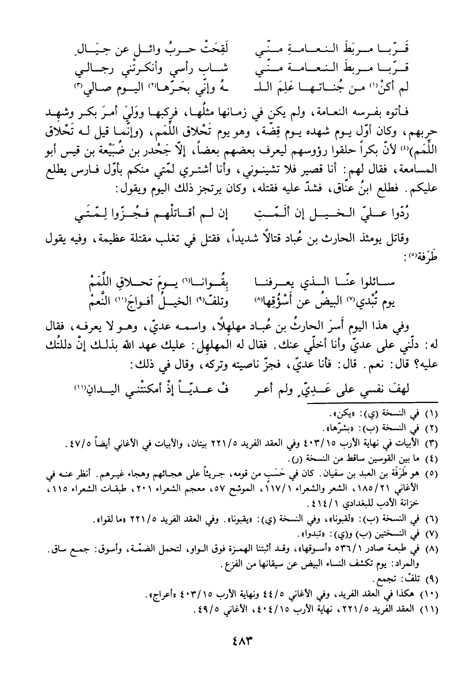 وَفِي هَذَا الْيَوْمِ أَسَرَ الْحَارِثُ بْنُ عُبَادٍ مُهَلْهِلًا، وَاسْمُهُ عَدِيٌّ، وَهُوَ لَا يَعْرِفُهُ، فَقَالَ لَهُ: دُلَّنِي عَلَى عَدِيٍّ وَأَنَا أُخَلِّي عَنْكَ. فَقَالَ لَهُ الْمُهَلْهِلُ: عَلَيْكَ عَهْدُ اللَّهِ بِذَلِكَ إِنْ دَلَلْتُكَ عَلَيْهِ؟ قَالَ: نَعَمْ. قَالَ: فَأَنَا عَدِيٌّ، فَجَزَّ نَاصِيَتَهُ وَتَرَكَهُ، وَقَالَ فِي ذَلِكَ:
