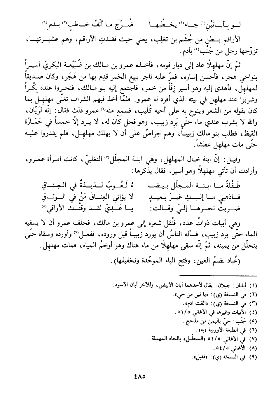 وَهِيَ أَبْيَاتٌ ذَوَاتُ عَدَدٍ، فَنُقِلَ شِعْرُهُ إِلَى عَمْرِو بْنِ مَالِكٍ، فَحَلَفَ عَمْرٌو أَنْ لَا يَسْقِيَهُ الْمَاءَ حَتَّى يَرِدَ زَبِيبٌ، فَسَأَلَهُ النَّاسُ أَنْ يُورِدَ زَبِيبًا قَبْلَ وُرُودِهِ، فَفَعَلَ وَأَوْرَدَهُ وَسَقَاهُ حَتَّى يَتَحَلَّلَ مِنْ يَمِينِهِ، ثُمَّ إِنَّهُ سَقَى مُهَلْهِلًا مِنْ مَاءٍ هُنَاكَ هُوَ أَوْخَمُ الْمِيَاهِ، فَمَاتَ مُهَلْهِلٌ.