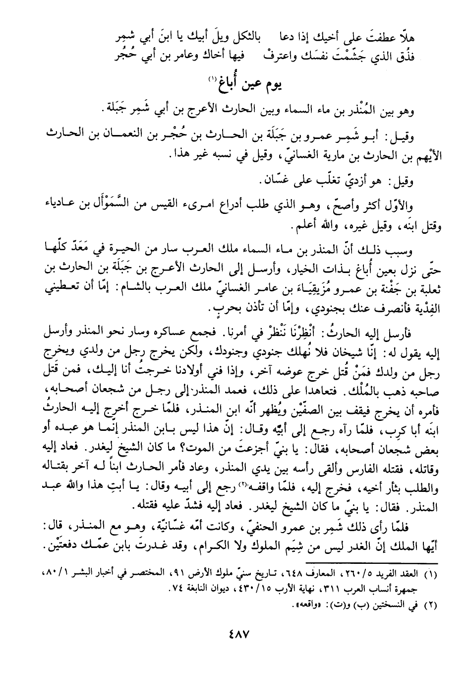 فَلَمَّا رَأَى ذَلِكَ شِمْرُ بْنُ عَمْرٍو الْحَنَفِيُّ، وَكَانَتْ أَمُّهُ غَسَّانِيَّةٌ، وَهُوَ مَعَ الْمُنْذِرِ، قَالَ: أَيُّهَا الْمَلِكُ إِنَّ الْغَدْرَ لَيْسَ مِنْ شِيَمِ الْمُلُوكِ وَلَا الْكِرَامِ، وَقَدْ غَدَرْتَ بِابْنِ عَمِّكَ دُفْعَتَيْنِ،