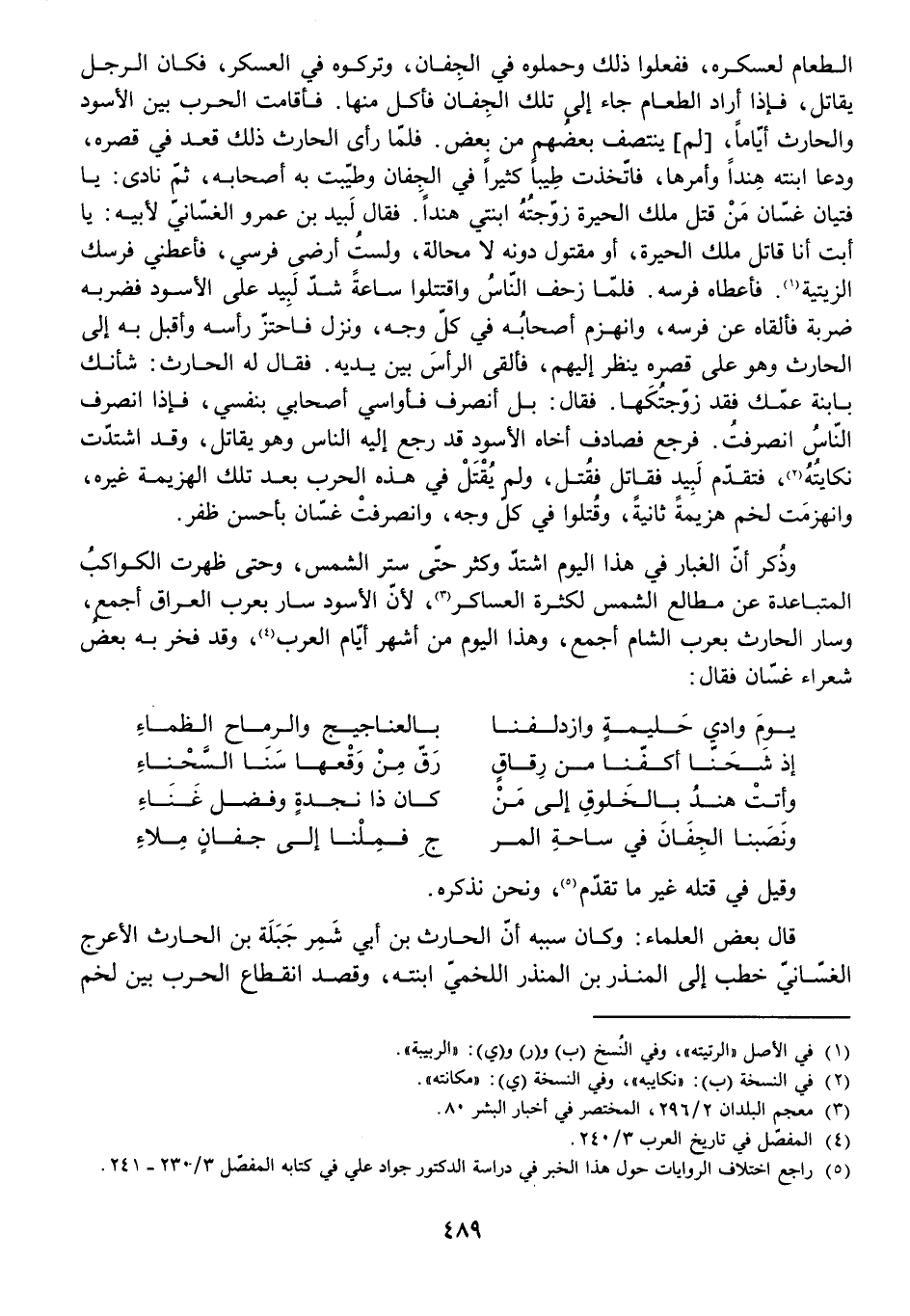 الطَّعَامَ لِعَسْكَرِهِ، فَفَعَلُوا ذَلِكَ وَحَمَلُوهُ فِي الْجِفَانِ وَتَرَكُوهُ فِي الْعَسْكَرِ، فَكَانَ الرَّجُلُ يُقَاتِلُ فَإِذَا أَرَادَ الطَّعَامَ جَاءَ إِلَى تِلْكَ الْجِفَانِ فَأَكَلَ مِنْهَا. فَأَقَامَتِ الْحَرْبُ بَيْنَ الْأَسْوَدِ وَالْحَارِثِ أَيَّامًا لَمْ يَنْتَصِفْ بَعْضُهُمْ مِنْ بَعْضٍ. فَلَمَّا رَأَى الْحَارِثُ ذَلِكَ قَعَدَ فِي قَصْرِهِ وَدَعَا ابْنَتَهُ هِنْدًا وَأَمْرَهَا فَاتَّخَذَتْ طِيبًا كَثِيرًا فِي الْجِفَانِ وَطَيَّبَتْ بِهِ أَصْحَابَهُ، ثُمَّ نَادَى: يَا فِتْيَانَ غَسَّانَ مَنْ قَتَلَ مَلِكَ الْحِيرَةِ زَوَّجْتُهُ ابْنَتِي هِنْدًا. فَقَالَ لَبِيدُ بْنُ عَمْرٍو الْغَسَّانِيُّ لِأَبِيهِ: يَا أَبَتِ أَنَا قَاتِلُ مَلِكِ الْحِيرَةِ أَوْ مَقْتُولٌ دُونَهُ لَا مَحَالَةَ، وَلَسْتُ أَرْضَى فَرَسِي فَأَعْطِنِي فَرَسَكَ الزَّيْتِيَّةَ. فَأَعْطَاهُ فَرَسَهُ. فَلَمَّا زَحَفَ النَّاسُ وَاقْتَتَلُوا سَاعَةً، شَدَّ لَبِيدٌ عَلَى الْأَسْوَدِ فَضَرَبَهُ ضَرْبَةً فَأَلْقَاهُ عَنْ فَرَسِهِ، وَانْهَزَمَ أَصْحَابُهُ فِي كُلِّ وَجْهٍ، وَنَزَلَ فَاحْتَزَّ رَأْسَهُ وَأَقْبَلَ بِهِ إِلَى الْحَارِثِ، وَهُوَ عَلَى قَصْرِهِ يَنْظُرُ إِلَيْهِمْ، فَأَلْقَى الرَّأْسَ بَيْنَ يَدَيْهِ. فَقَالَ لَهُ الْحَارِثُ: شَأْنَكَ بِابْنَةِ عَمِّكِ فَقَدْ زَوَّجْتُكَهَا. فَقَالَ: بَلْ أَنْصَرِفُ فَأُوَاسِي أَصْحَابِي بِنَفْسِي فَإِذَا انْصَرَفَ النَّاسُ انْصَرَفْتُ. فَرَجَعَ فَصَادَفَ أَخَاهُ الْأَسْوَدَ قَدْ رَجَعَ إِلَيْهِ النَّاسُ وَهُوَ يُقَاتِلُ وَقَدِ اشْتَدَّتْ نِكَايَتُهُ، فَتَقَدَّمَ لَبِيدٌ فَقَاتَلَ فَقُتِلَ، وَلَمْ يُقْتَلْ فِي هَذِهِ الْحَرْبِ بَعْدَ تِلْكَ الْهَزِيمَةِ غَيْرُهُ، وَانْهَزَمَتْ لَخْمٌ هَزِيمَةً ثَانِيَةً وَقُتِلُوا فِي كُلِّ وَجْهٍ، وَانْصَرَفَتْ غَسَّانُ بِأَحْسَنِ ظَفَرٍ.