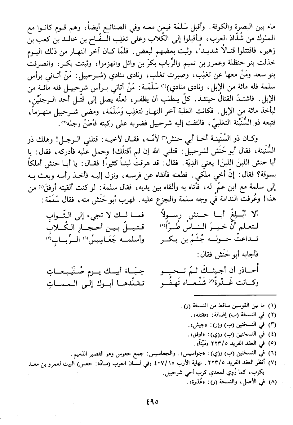 مَاءٌ بَيْنَ الْبَصْرَةِ وَالْكُوفَةِ. وَأَقْبَلَ سَلَمَةُ فِيمَنْ مَعَهُ وَفِي الصَّنَائِعِ أَيْضًا، وَهُمْ قَوْمٌ كَانُوا مَعَ الْمُلُوكِ مِنْ شُذَّاذِ الْعَرَبِ، فَأَقْبَلُوا إِلَى الْكُلَابِ، وَعَلَى تَغْلِبَ السَّفَّاحُ بْنُ خَالِدِ بْنِ كَعْبِ بْنِ زُهَيْرٍ، فَاقْتَتَلُوا قِتَالًا شَدِيدًا، وَثَبَتَ بَعْضُهُمْ لِبَعْضٍ. فَلَمَّا كَانَ آخِرُ النَّهَارِ مِنْ ذَلِكَ الْيَوْمِ خَذَلَتْ بَنُو حَنْظَلَةَ وَعَمْرِو بْنِ تَمِيمٍ وَالرِّبَابُ بَكْرَ بْنَ وَائِلٍ وَانْهَزَمُوا، وَثَبَتَتْ بَكْرٌ وَانْصَرَفَتْ بَنُو سَعْدٍ وَمَنْ مَعَهَا عَنْ تَغْلِبَ وَصَبَرَتْ تَغْلِبُ، وَنَادَى مُنَادِي شُرَحْبِيلَ: مَنْ أَتَانِي بِرَأْسِ سَلَمَةَ فَلَهُ مِائَةٌ مِنَ الْإِبِلِ، وَنَادَى مُنَادِي سَلَمَةَ: مَنْ أَتَانِي بِرَأْسِ شُرَحْبِيلَ فَلَهُ مِائَةٌ مِنَ الْإِبِلِ. فَاشْتَدَّ الْقِتَالُ حِينَئِذٍ كُلٌّ يَطْلُبُ أَنْ يَظْفَرَ لَعَلَّهُ يَصِلُ إِلَى قَتْلِ أَحَدِ الرَّجُلَيْنِ لِيَأْخُذَ مِائَةً مِنَ الْإِبِلِ، فَكَانَتِ الْغَلَبَةُ آخِرَ النَّهَارِ لِتَغْلِبَ وَسَلَمَةَ، وَمَضَى شُرَحْبِيلُ مُنْهَزِمًا، فَتَبِعَهُ ذُو السُّنَيْنَةِ التَغْلِبِيُّ، فَالْتَفَتَ إِلَيْهِ شُرَحْبِيلُ فَضَرَبَهُ عَلَى رُكْبَتِهِ فَأَطَنَّ رِجْلَهُ.