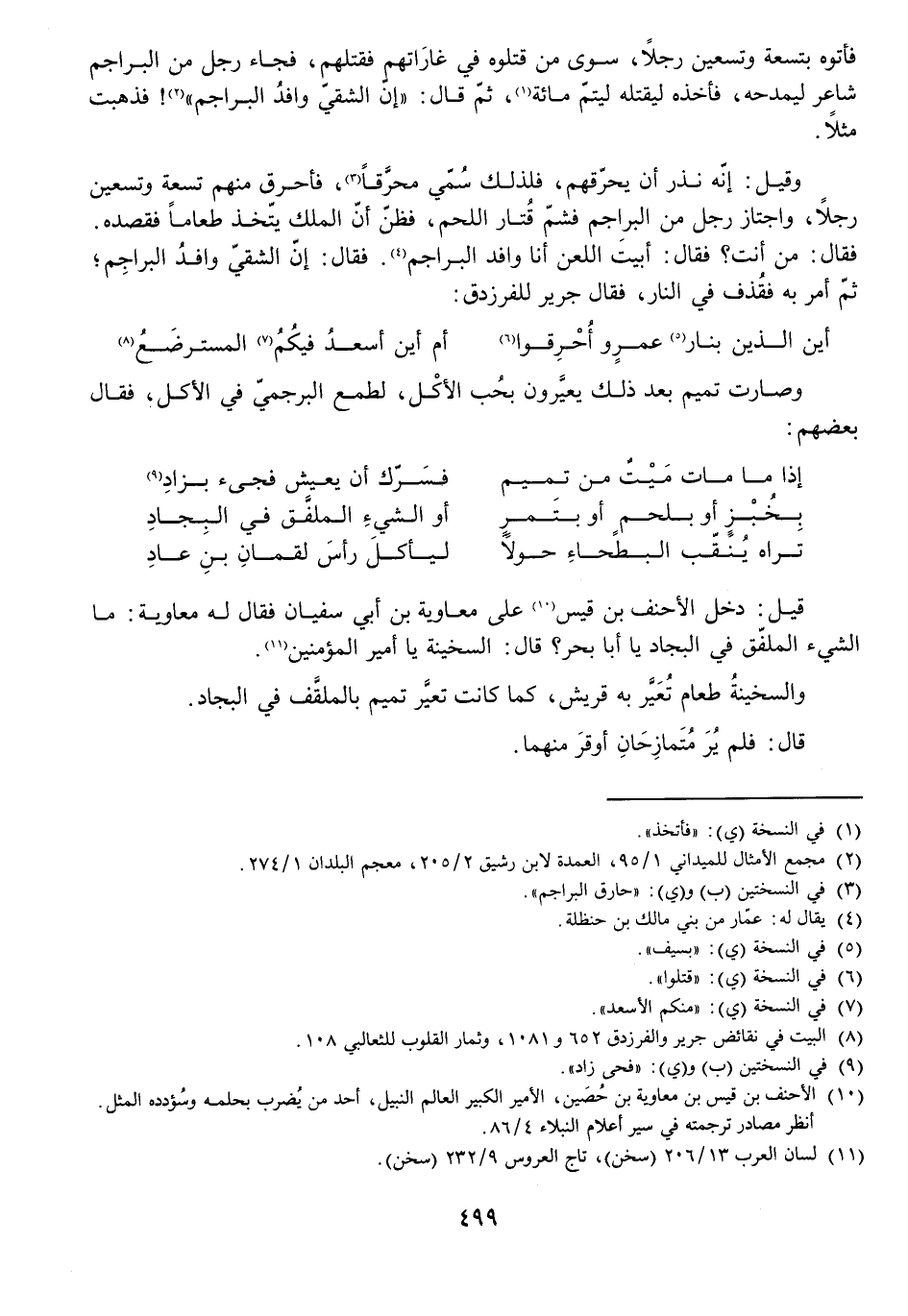 فَأَتَوْهُ بِتِسْعَةٍ وَتِسْعِينَ رَجُلًا سِوَى مَنْ قَتَلُوهُ فِي غَارَاتِهِمْ فَقَتَلَهُمْ، فَجَاءَ رَجُلٌ مِنَ الْبَرَاجِمِ شَاعِرٌ لِيَمْدَحَهُ فَأَخَذَهُ لِيَقْتُلَهُ لِيُتِمَّ مِائَةً، ثُمَّ قَالَ: " إِنَّ الشَّقِيَّ وَافِدُ الْبَرَاجِمِ "! فَذَهَبَتْ مَثَلًا.