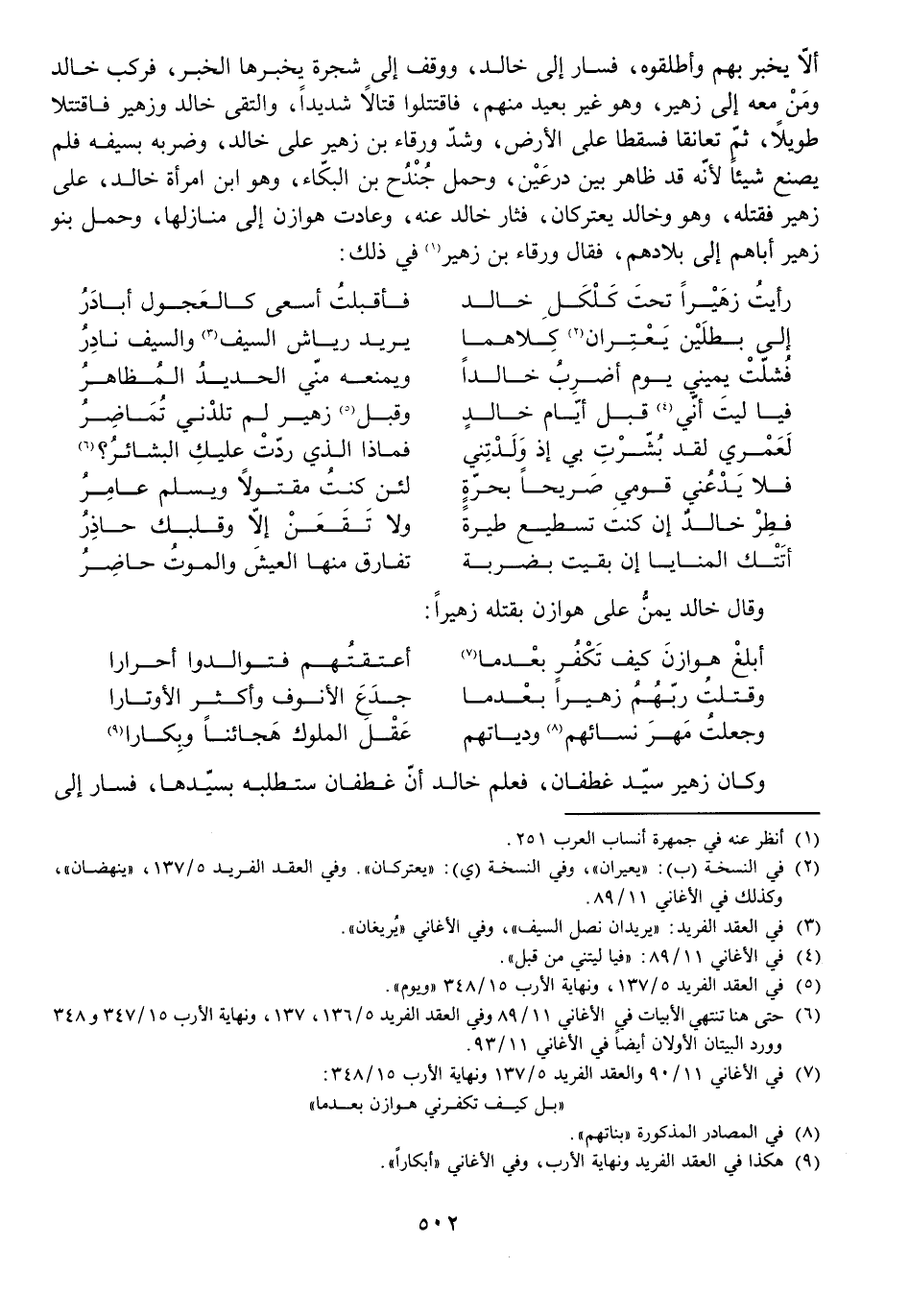 أَلَّا يُخْبِرَ بِهِمْ وَأَطْلَقُوهُ، فَسَارَ إِلَى خَالِدٍ وَوَقَفَ إِلَى شَجَرَةٍ يُخْبِرُهَا الْخَبَرَ، فَرَكِبَ خَالِدٌ وَمَنْ مَعَهُ إِلَى زُهَيْرٍ، وَهُوَ غَيْرُ بَعِيدٍ مِنْهُمْ، فَاقْتَتَلُوا قِتَالًا شَدِيدًا، وَالْتَقَى خَالِدٌ وَزُهَيْرٌ فَاقْتَتَلَا طَوِيلًا ثُمَّ تَعَانَقَا فَسَقَطَا عَلَى الْأَرْضِ، وَشَدَّ وَرْقَاءُ بْنُ زُهَيْرٍ عَلَى خَالِدٍ وَضَرَبَهُ بِسَيْفِهِ فَلَمْ يَصْنَعْ شَيْئًا لِأَنَّهُ قَدْ ظَاهَرَ بَيْنَ دِرْعَيْنِ، وَحَمَلَ جُنْدُحُ بْنُ الْبَكَّاءِ، وَهُوَ ابْنُ امْرَأَةِ خَالِدٍ، عَلَى زُهَيْرٍ فَقَتَلَهُ، وَهُوَ وَخَالِدٌ يَعْتَرِكَانِ، فَثَارَ خَالِدٌ عَنْهُ وَعَادَتْ هَوَازِنُ إِلَى مَنَازِلِهَا، وَحَمَلَ بَنُو زُهَيْرٍ أَبَاهُمْ إِلَى بِلَادِهِمْ، فَقَالَ وَرْقَاءُ بْنُ زُهَيْرٍ فِي ذَلِكَ: