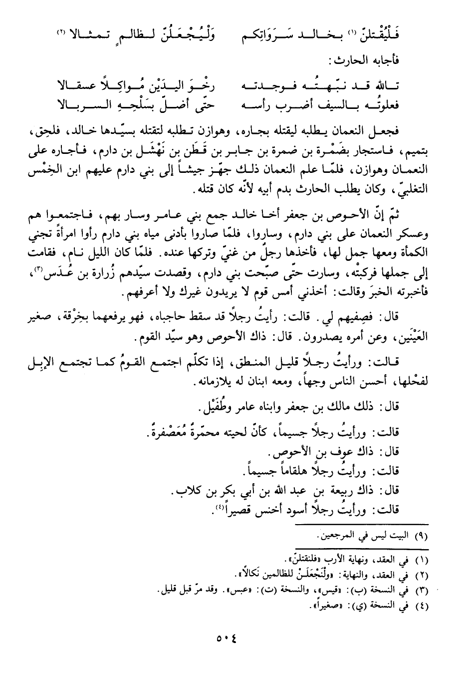 ثُمَّ إِنَّ الْأَحْوَصَ بْنَ جَعْفَرٍ أَخَا خَالِدٍ جَمَعَ بَنِي عَامِرٍ وَسَارَ بِهِمْ، فَاجْتَمَعُوا هُمْ وَعَسْكَرُ النُّعْمَانِ عَلَى بَنِي دَارِمٍ وَسَارُوا، فَلَمَّا صَارُوا بِأَدْنَى مِيَاهِ بَنِي دَارِمٍ رَأَوُا امْرَأَةً تَجْنِي الْكَمْأَةَ وَمَعَهَا جَمَلٌ لَهَا، فَأَخَذَهَا رَجُلٌ مِنْ غَنِيٍّ وَتَرَكَهَا عِنْدَهُ. فَلَمَّا كَانَ اللَّيْلُ نَامَ فَقَامَتْ إِلَى جَمَلِهَا فَرَكِبَتْهُ، وَسَارَتْ حَتَّى صَبَّحَتْ بَنِي دَارِمٍ، وَقَصَدَتْ سَيِّدَهُمْ زُرَارَةَ بْنَ عُدَسٍ فَأَخْبَرَتْهُ الْخَبَرَ وَقَالَتْ: أَخَذَنِي أَمْسِ قَوْمٌ لَا يُرِيدُونَ غَيْرَكَ وَلَا أَعْرِفُهُمْ. قَالَ: فَصِفِيهِمْ لِي. قَالَتْ: رَأَيْتُ رَجُلًا قَدْ سَقَطَ حَاجِبَاهُ فَهُوَ يَرْفَعُهُمَا بِخِرْقَةٍ، صَغِيرَ الْعَيْنَيْنِ، وَعَنْ أَمْرِهِ يَصْدُرُونَ. قَالَ: ذَاكَ الْأَحْوَصُ وَهُوَ سَيِّدُ الْقَوْمِ. قَالَتْ: وَرَأَيْتُ رَجُلًا قَلِيلَ الْمَنْطِقِ إِذَا تَكَلَّمَ اجْتَمَعَ الْقَوْمُ كَمَا تَجْتَمِعُ الْإِبِلُ لِفَحْلِهَا، أَحْسَنَ النَّاسِ وَجْهًا، وَمَعَهُ ابْنَانِ لَهُ يُلَازِمَانِهِ. قَالَ: ذَلِكَ مَالِكُ بْنُ جَعْفَرٍ وَابْنَاهُ عَامِرٌ وَطُفَيْلٌ. قَالَتْ: وَرَأَيْتُ رَجُلًا جَسِيمًا كَأَنَّ لِحْيَتَهُ مُحَمَّرَةٌ مُعَصْفَرَةٌ. قَالَ: ذَاكَ عَوْفُ بْنُ الْأَحْوَصِ. قَالَتْ: وَرَأَيْتُ رَجُلًا هِلْقَامًا جَسِيمًا. قَالَ: ذَاكَ رَبِيعَةُ بْنُ عَبْدِ اللَّهِ بْنِ أَبِي بَكْرِ بْنِ كُلَابٍ. قَالَتْ: وَرَأَيْتُ رَجُلًا أَسْوَدَ أَخْنَسَ قَصِيرًا.