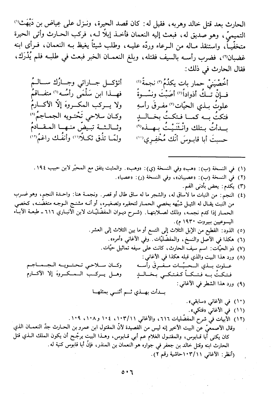 الْحَارِثَ بَعْدَ قَتْلِ خَالِدٍ وَهَرَبِهِ، فَقِيلَ لَهُ: كَانَ قَصَدَ الْحِيرَةَ وَنَزَلَ عَلَى عِيَاضِ بْنِ دَيْهَثٍ التَّمِيمِيِّ وَهُوَ صَدِيقٌ لَهُ، فَبَعَثَ إِلَيْهِ النُّعْمَانُ فَأَخَذَ إِبِلًا لَهُ، فَرَكِبَ الْحَارِثُ وَأَتَى الْحِيرَةَ مُتَخَفِّيًا وَاسْتَنْقَذَ مَالَهُ مِنَ الرِّعَاءِ وَرَدَّهُ عَلَيْهِ وَطَلَبَ شَيْئًا يَغِيظُ بِهِ النُّعْمَانَ، فَرَأَى ابْنَهُ غَضْبَانَ فَضَرَبَ رَأْسَهُ بِالسَّيْفِ فَقَتَلَهُ، وَبَلَغَ النُّعْمَانَ الْخَبَرُ فَبَعَثَ فِي طَلَبِهِ فَلَمْ يُدْرَكْ، فَقَالَ الْحَارِثُ فِي ذَلِكَ: