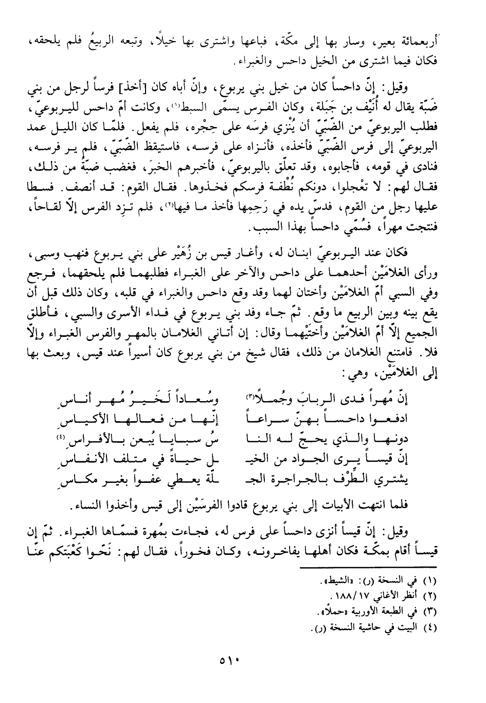فَكَانَ عِنْدَ الْيَرْبُوعِيِّ ابْنَانِ لَهُ، وَأَغَارَ قَيْسُ بْنُ زُهَيْرٍ عَلَى بَنِي يَرْبُوعٍ فَنَهَبَ وَسَبَى، وَرَأَى الْغُلَامَيْنِ أَحَدَهُمَا عَلَى دَاحِسٍ وَالْآخِرَ عَلَى الْغَبْرَاءِ فَطَلَبَهُمَا فَلَمْ يَلْحَقْهُمَا، فَرَجَعَ وَفِي السَّبْيِ أُمُّ الْغُلَامَيْنِ وَأُخْتَانِ لَهُمَا وَقَدْ وَقَعَ دَاحِسٌ وَالْغَبْرَاءُ فِي قَلْبِهِ، وَكَانَ ذَلِكَ قَبْلَ أَنْ يَقَعَ بَيْنَهُ وَبَيْنَ الرَّبِيعِ مَا وَقَعَ. ثُمَّ جَاءَ وَفْدُ بَنِي يَرْبُوعٍ فِي فِدَاءِ الْأَسْرَى وَالسَّبْيِ، فَأَطْلَقَ الْجَمِيعَ إِلَّا أُمَّ الْغُلَامَيْنِ وَأُخْتَيْهِمَا وَقَالَ: إِنْ أَتَانِي الْغُلَامَانِ بِالْمُهْرِ وَالْفَرَسِ الْغَبْرَاءِ وَإِلَّا فَلَا. فَامْتَنَعَ الْغُلَامَانِ مِنْ ذَلِكَ، فَقَالَ شَيْخٌ مِنْ بَنِي يَرْبُوعٍ كَانَ أَسِيرًا عِنْدَ قَيْسٍ، وَبَعَثَ بِهَا إِلَى الْغُلَامَيْنِ، وَهِيَ: