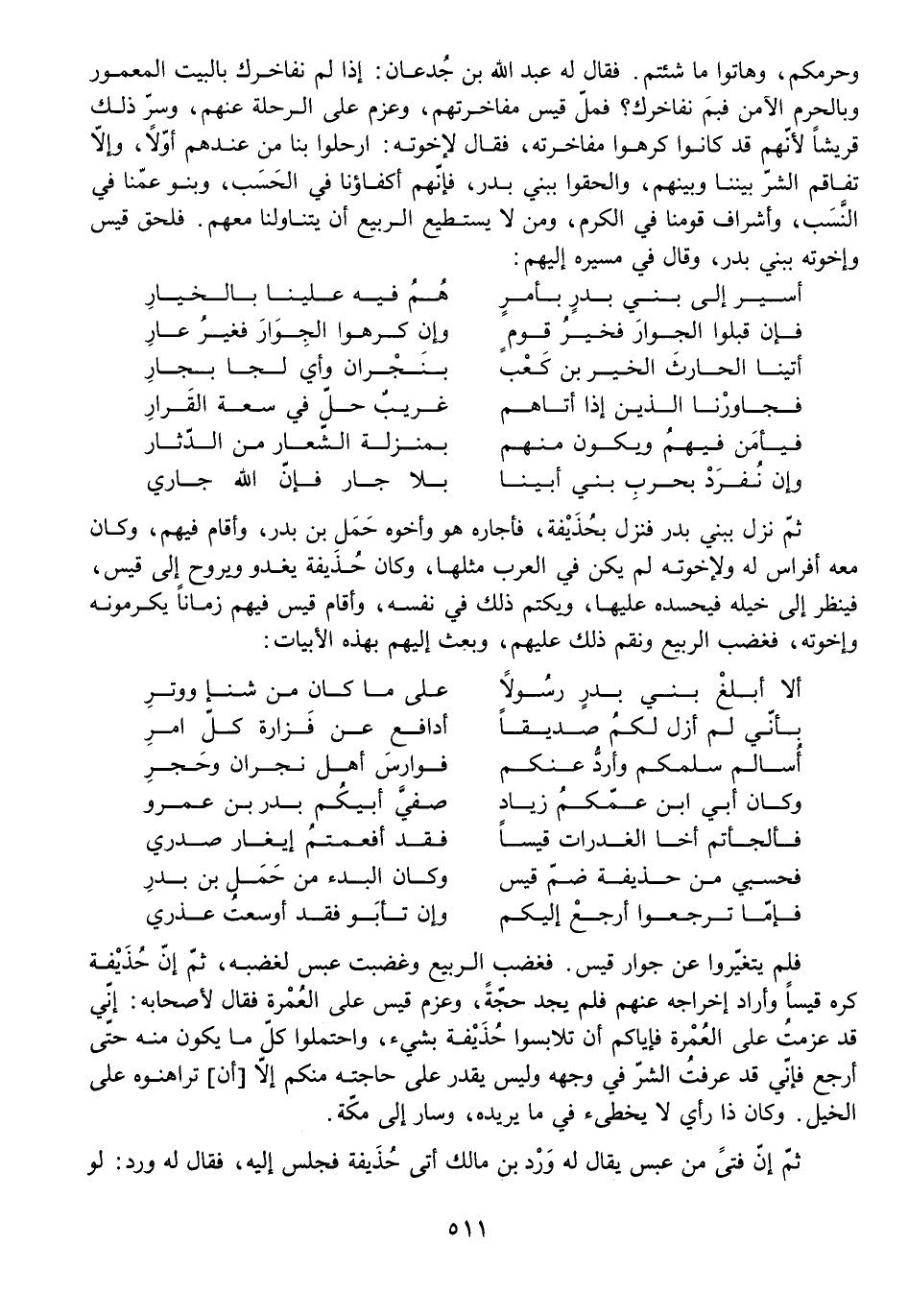 وَحَرَمَكُمْ وَهَاتُوا مَا شِئْتُمْ. فَقَالَ لَهُ عَبْدُ اللَّهِ بْنُ جُدْعَانَ: إِذَا لَمْ نُفَاخِرْكَ بِالْبَيْتِ الْمَعْمُورِ وَبِالْحَرَمِ الْآمِنِ فَبِمَ نُفَاخِرُكَ؟ فَمَلَّ قَيْسٌ مُفَاخَرَتَهُمْ وَعَزَمَ عَلَى الرِّحْلَةِ عَنْهُمْ، وَسَرَّ ذَلِكَ قُرَيْشًا لِأَنَّهُمْ قَدْ كَانُوا كَرِهُوا مُفَاخَرَتَهُ، فَقَالَ لِإِخْوَتِهِ: ارْحَلُوا بِنَا مِنْ عِنْدِهِمْ أَوَّلًا وَإِلَّا تَفَاقَمَ الشَّرُّ بَيْنَنَا وَبَيْنَهُمْ، وَالْحَقُوا بِبَنِي بَدْرٍ فَإِنَّهُمْ أَكْفَاؤُنَا فِي الْحَسَبِ، وَبَنُو عَمِّنَا فِي النَّسَبِ، وَأَشْرَافُ قَوْمِنَا فِي الْكَرَمِ، وَمَنْ لَا يَسْتَطِيعُ الرَّبِيعُ أَنْ يَتَنَاوَلَنَا مَعَهُمْ. فَلَحِقَ قَيْسٌ وَإِخْوَتُهُ بِبَنِي بَدْرٍ، وَقَالَ فِي مَسِيرِهِ إِلَيْهِمْ: