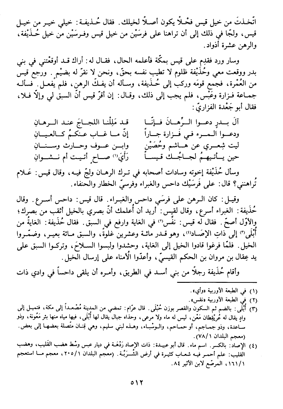 اتَّخَذْتَ مِنْ خَيْلِ قَيْسٍ فَحْلًا يَكُونُ أَصْلًا لِخَيْلِكَ. فَقَالَ حُذَيْفَةُ: خَيْلِي خَيْرٌ مِنْ خَيْلِ قَيْسٍ، وَلَجَا فِي ذَلِكَ إِلَى أَنْ تَرَاهَنَا عَلَى فَرَسَيْنِ مِنْ خَيْلِ قَيْسٍ وَفَرَسَيْنِ مِنْ خَيْلِ حُذَيْفَةَ، وَالرَّهْنُ عَشْرَةُ أَذْوَادٍ.