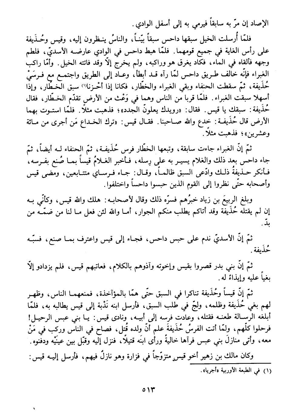 ثُمَّ إِنَّ قَيْسًا وَحُذَيْفَةَ تَنَاكَرَا فِي السَّبْقِ حَتَّى هَمَّا بِالْمُؤَاخَذَةِ، فَمَنَعَهُمَا النَّاسُ، وَظَهَرَ لَهُمْ بَغْيُ حُذَيْفَةَ وَظُلْمُهُ، وَلَجَّ فِي طَلَبِ السَّبْقِ، فَأَرْسَلَ ابْنَهُ نُدْبَةَ إِلَى قَيْسٍ يُطَالِبُهُ بِهِ، فَلَمَّا أَبْلَغَهُ الرِّسَالَةَ طَعَنَهُ فَقَتَلَهُ، وَعَادَتْ فَرَسُهُ إِلَى أَبِيهِ، وَنَادَى قَيْسٌ: يَا بَنِي عَبْسٍ الرَّحِيلَ! فَرَحَلُوا كُلُّهُمْ، وَلَمَّا أَتَتِ الْفَرَسُ حُذَيْفَةَ عَلِمَ أَنَّ وَلَدَهُ قُتِلَ، فَصَاحَ فِي النَّاسِ وَرَكِبَ فِي مَنْ مَعَهُ وَأَتَى مَنَازِلَ بَنِي عَبْسٍ فَرَآهَا خَالِيَةً وَرَأَى ابْنَهُ قَتِيلًا، فَنَزَلَ إِلَيْهِ وَقَبَّلَ بَيْنَ عَيْنَيْهِ وَدَفَنُوهُ.