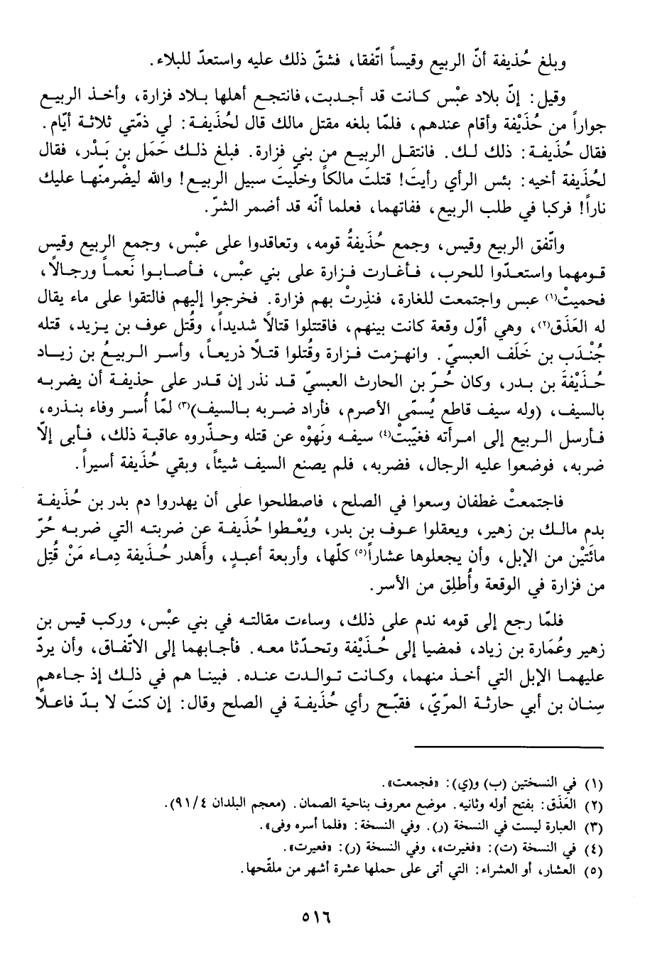 فَاجْتَمَعَتْ غَطَفَانُ وَسَعَوْا فِي الصُّلْحِ، فَاصْطَلَحُوا عَلَى أَنْ يُهْدِرُوا دَمَ بَدْرِ بْنِ حُذَيْفَةَ بِدَمِ مَالِكِ بْنِ زُهَيْرٍ، وَيَعْقِلُوا عَوْفَ بْنَ بَدْرٍ، وَيُعْطُوا حُذَيْفَةَ عَنْ ضَرْبَتِهِ الَّتِي ضَرَبَهُ حُرٌّ مِائَتَيْنِ مِنَ الْإِبِلِ، وَأَنْ يَجْعَلُوهَا عُشَارًا كُلَّهَا، وَأَرْبَعَةَ أَعْبُدٍ، وَأَهْدَرَ حُذَيْفَةُ دِمَاءَ مَنْ قُتِلَ مِنْ فَزَارَةَ فِي الْوَقْعَةِ وَأُطْلِقَ مِنَ الْأَسْرِ.