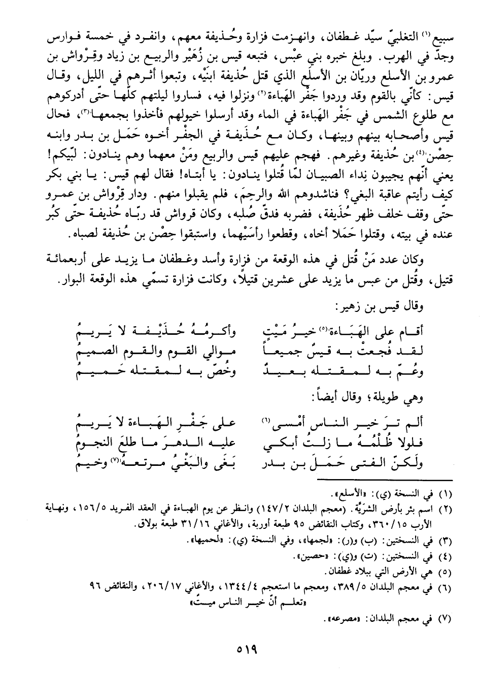 سَبِيعٍ التَّغْلِبِيُّ سَيِّدُ غَطَفَانَ، وَانْهَزَمَتْ فَزَارَةُ وَحُذَيْفَةُ مَعَهُمْ وَانْفَرَدَ فِي خَمْسَةِ فَوَارِسَ وَجَدَّ فِي الْهَرَبِ. وَبَلَغَ خَبَرُهُ بَنِي عَبْسٍ، فَتَبِعَهُ قَيْسُ بْنُ زُهَيْرٍ، وَالرَّبِيعُ بْنُ زِيَادٍ، وَقِرْوَاشُ بْنُ عَمْرِو بْنِ الْأَسْلَعِ، وَرَيَّانُ بْنُ الْأَسْلَعِ الَّذِي قَتَلَ حُذَيْفَةُ ابْنَيْهِ، وَتَبِعُوا أَثَرَهُمْ فِي اللَّيْلِ وَقَالَ قَيْسٌ: كَأَنِّي بِالْقَوْمِ وَقَدْ وَرَدُوا جَفْرَ الْهَبَاءَةِ وَنَزَلُوا فِيهِ، فَسَارُوا لَيْلَتَهُمْ كُلَّهَا حَتَّى أَدْرَكُوهُمْ مَعَ طُلُوعِ الشَّمْسِ فِي جَفْرِ الْهَبَاءَةِ فِي الْمَاءِ، وَقَدْ أَرْسَلُوا خُيُولَهُمْ فَأَخَذُوا بِجَمْعِهَا، فَحَالَ قَيْسٌ وَأَصْحَابُهُ بَيْنَهُمْ وَبَيْنَهَا، وَكَانَ مَعَ حُذَيْفَةَ فِي الْجَفْرِ أَخُوهُ حَمَلُ بْنُ بَدْرٍ وَابْنُهُ حِصْنُ بْنُ حُذَيْفَةَ وَغَيْرُهُمْ. فَهَجَمَ عَلَيْهِمْ قَيْسٌ وَالرَّبِيعُ وَمَنْ مَعَهُمَا وَهُمْ يُنَادُونَ: لَبَّيْكُمُ لَبَّيْكُمُ! يَعْنِي أَنَّهُمْ يُجِيبُونَ نِدَاءَ الصَّبِيَّانِ لَمَّا قُتِلُوا يُنَادُونَ: يَا أَبَتَاهُ! فَقَالَ لَهُمْ قَيْسٌ: يَا بَنِي بَكْرٍ كَيْفَ رَأَيْتُمْ عَاقِبَةَ الْبَغْيِ؟ فَنَاشَدُوهُمُ اللَّهَ وَالرَّحِمَ، فَلَمْ يَقْبَلُوا مِنْهُمْ. وَدَارَ قِرْوَاشُ بْنُ عَمْرٍو حَتَّى وَقَفَ خَلْفَ حُذَيْفَةَ فَضَرَبَهُ فَدَقَّ صُلْبَهُ، وَكَانَ قِرْوَاشُ قَدْ رَبَّاهُ حُذَيْفَةُ حَتَّى كَبِرَ عِنْدَهُ فِي بَيْتِهِ، وَقَتَلُوا حَمَلًا أَخَاهُ وَقَطَعُوا رَأْسَيْهِمَا وَاسْتَبْقُوا حِصْنَ بْنَ حُذَيْفَةَ لِصِبَاهُ.