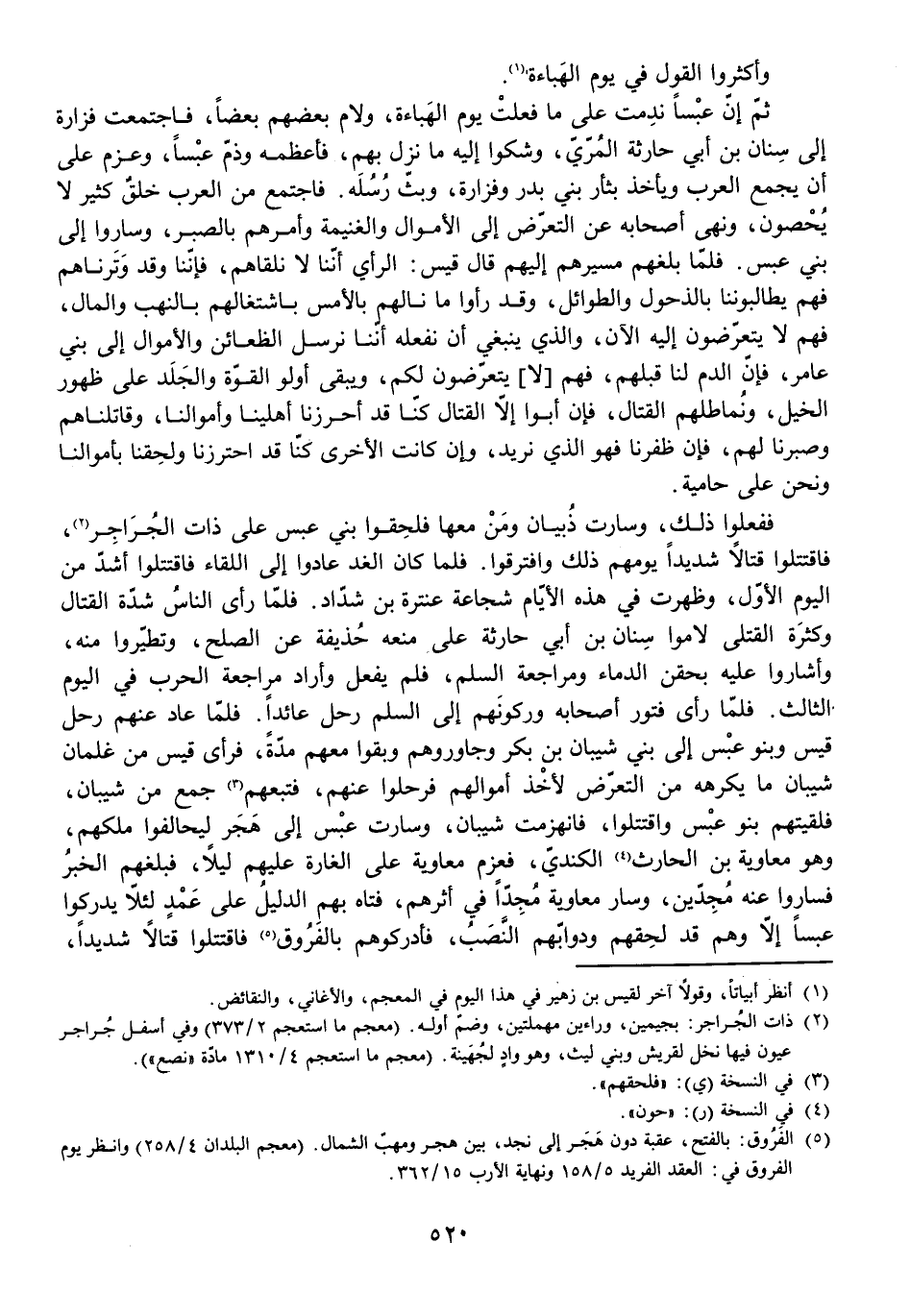 فَفَعَلُوا ذَلِكَ، وَسَارَتْ ذُبْيَانُ وَمَنْ مَعَهَا فَلَحِقُوا بَنِي عَبْسٍ عَلَى ذَاتِ الْجُرَاجِرِ فَاقْتَتَلُوا قِتَالًا شَدِيدًا يَوْمَهُمْ ذَلِكَ وَافْتَرَقُوا. فَلَمَّا كَانَ الْغَدُ عَادُوا إِلَى اللِّقَاءِ فَاقْتَتَلُوا أَشَدَّ مِنَ الْيَوْمِ الْأَوَّلِ، وَظَهَرَتْ فِي هَذِهِ الْأَيَّامِ شَجَاعَةُ عَنْتَرَةَ بْنِ شَدَّادٍ. فَلَمَّا رَأَى النَّاسُ شِدَّةَ الْقِتَالِ وَكَثْرَةَ الْقَتْلَى لَامُوا سِنَانَ بْنَ أَبِي حَارِثَةَ عَلَى مَنْعِهِ حُذَيْفَةَ عَنِ الصُّلْحِ، وَتَطَيَّرُوا مِنْهُ وَأَشَارُوا عَلَيْهِ بِحَقْنِ الدِّمَاءِ وَمُرَاجَعَةِ السِّلْمِ، فَلَمْ يَفْعَلْ وَأَرَادَ مُرَاجَعَةَ الْحَرْبِ فِي الْيَوْمِ الثَّالِثِ. فَلَمَّا رَأَى فُتُورَ أَصْحَابِهِ وَرُكُونَهُمْ إِلَى السِّلْمِ رَحَلَ عَائِدًا. فَلَمَّا عَادَ عَنْهُمْ رَحَلَ قَيْسٌ وَبَنُو عَبْسٍ إِلَى بَنِي شَيْبَانَ بْنِ بَكْرٍ وَجَاوَرُوهُمْ وَبَقَوْا مَعَهُمْ مُدَّةً، فَرَأَى قَيْسٌ مِنْ غِلْمَانِ شَيْبَانَ مَا يَكْرَهُهُ مِنَ التَّعَرُّضِ لِأَخْذِ أَمْوَالِهِمْ فَرَحَلَا عَنْهُمْ، فَتَبِعَهُمْ جَمْعٌ مِنْ شَيْبَانَ، فَلَقِيَتْهُمْ بَنُو عَبْسٍ وَاقْتَتَلُوا، فَانْهَزَمَتْ شَيْبَانُ وَسَارَتْ عَبْسٌ إِلَى هَجَرَ لِيُحَالِفُوا مَلِكَهُمْ، وَهُوَ مُعَاوِيَةُ بْنُ الْحَارِثِ الْكِنْدِيُّ، فَعَزَمَ مُعَاوِيَةُ عَلَى الْغَارَةِ عَلَيْهِمْ لَيْلًا، فَبَلَغَهُمُ الْخَبَرُ فَسَارُوا عَنْهُ مُجِدِّينَ، وَسَارَ مُعَاوِيَةُ مُجِدًّا فِي أَثَرِهِمْ، فَتَاهَ بِهِمُ الدَّلِيلُ عَلَى عَمْدٍ لِئَلَّا يُدْرِكُوا عَبْسًا إِلَّا وَهُمْ قَدْ لَحِقَهُمْ وَدَوَابَّهُمُ النَّصَبُ، فَأَدْرَكُوهُمْ بِالْفُرُوقِ فَاقْتَتَلُوا قِتَالًا شَدِيدًا