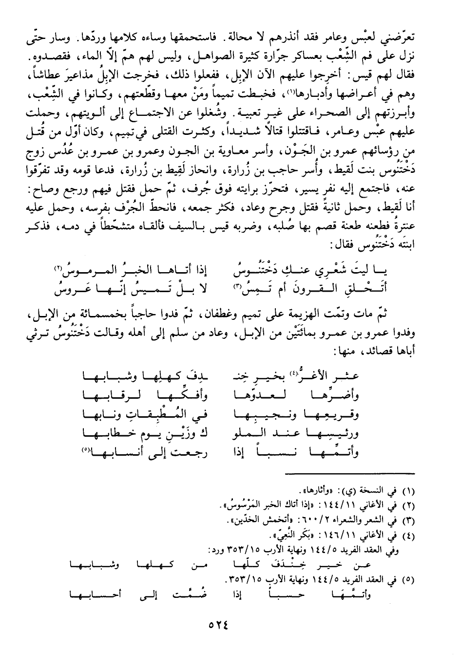 تُعَرِّضْنِي لَعَبْسٍ وَعَامِرٍ فَقَدْ أَنْذَرَهُمْ لَا مَحَالَةَ، فَاسْتَحْمَقَهَا وَسَاءَهُ كَلَامُهَا وَرَدَّهَا. وَسَارَ حَتَّى نَزَلَ عَلَى فَمِ الشِّعْبِ بِعَسَاكِرَ جَرَّارَةٍ كَثِيرَةِ الصَّوَاهِلِ وَلَيْسَ لَهُمْ هَمٌّ إِلَّا الْمَاءَ، فَقَصَدُوهُ. فَقَالَ لَهُمْ قَيْسٌ: أَخْرِجُوا عَلَيْهِمُ الْآنَ الْإِبِلَ، فَفَعَلُوا ذَلِكَ، فَخَرَجَتِ الْإِبِلُ مَذَاعِيرَ عِطَاشًا وَهُمْ فِي أَعْرَاضِهَا وَأَدْبَارِهَا، فَخَبَطَتْ تَمِيمًا وَمَنْ مَعَهَا وَقَطَّعَتْهُمْ، وَكَانُوا فِي الشِّعْبِ، وَأَبْرَزَتْهُمْ إِلَى الصَّحْرَاءِ عَلَى غَيْرِ تَعْبِيَةٍ. وَشُغِلُوا عَنْ الِاجْتِمَاعِ إِلَى أَلْوِيَتِهِمْ، وَحَمَلَتْ عَلَيْهِمْ عَبْسٌ وَعَامِرٌ فَاقْتَتَلُوا قِتَالًا شَدِيدًا وَكَثُرَتِ الْقَتْلَى فِي تَمِيمٍ، وَكَانَ أَوَّلَ مَنْ قُتِلَ مِنْ رُؤَسَائِهِمْ عَمْرُو بْنُ الْجَوْنِ، وَأُسِرَ مُعَاوِيَةُ بْنُ الْجَوْنِ وَعَمْرُو بْنُ عَمْرِو بْنِ عُدَسٍ زَوْجُ تَخْتَنُوسْ بِنْتِ لَقِيطٍ، وَأُسِرَ حَاجِبُ بْنُ زُرَارَةَ، وَانْحَازَ لَقِيطُ بْنُ زُرَارَةَ، فَدَعَا قَوْمَهُ وَقَدْ تَفَرَّقُوا عَنْهُ، فَاجْتَمَعَ إِلَيْهِ نَفَرٌ يَسِيرٌ، فَتَحَرَّزَ بِرَايَتِهِ فَوْقَ جُرْفٍ ثُمَّ حَمَلَ فَقَتَلَ فِيهِمْ وَرَجَعَ وَصَاحَ: أَنَا لَقِيطٌ، وَحَمَلَ ثَانِيَةً فَقَتَلَ وَجَرَحَ وَعَادَ، فَكَثُرَ جَمْعُهُ، فَانْحَطَّ الْجُرْفُ بِفَرَسِهِ، وَحَمَلَ عَلَيْهِ عَنْتَرَةُ فَطَعَنَهُ طَعْنَةً قَصَمَ بِهَا صُلْبَهُ، وَضَرَبَهُ قَيْسٌ بِالسَّيْفِ فَأَلْقَاهُ مُتَشَحِّطًا فِي دَمِهِ، فَذَكَرَ ابْنَتَهُ دَخْتَنُوسَ فَقَالَ: يَا لَيْتَ شِعْرِي عَنْكِ دَخْتَنُوسُ إِذَا أَتَاهَا الْخَبَرُ الْمَرْمُوسُ