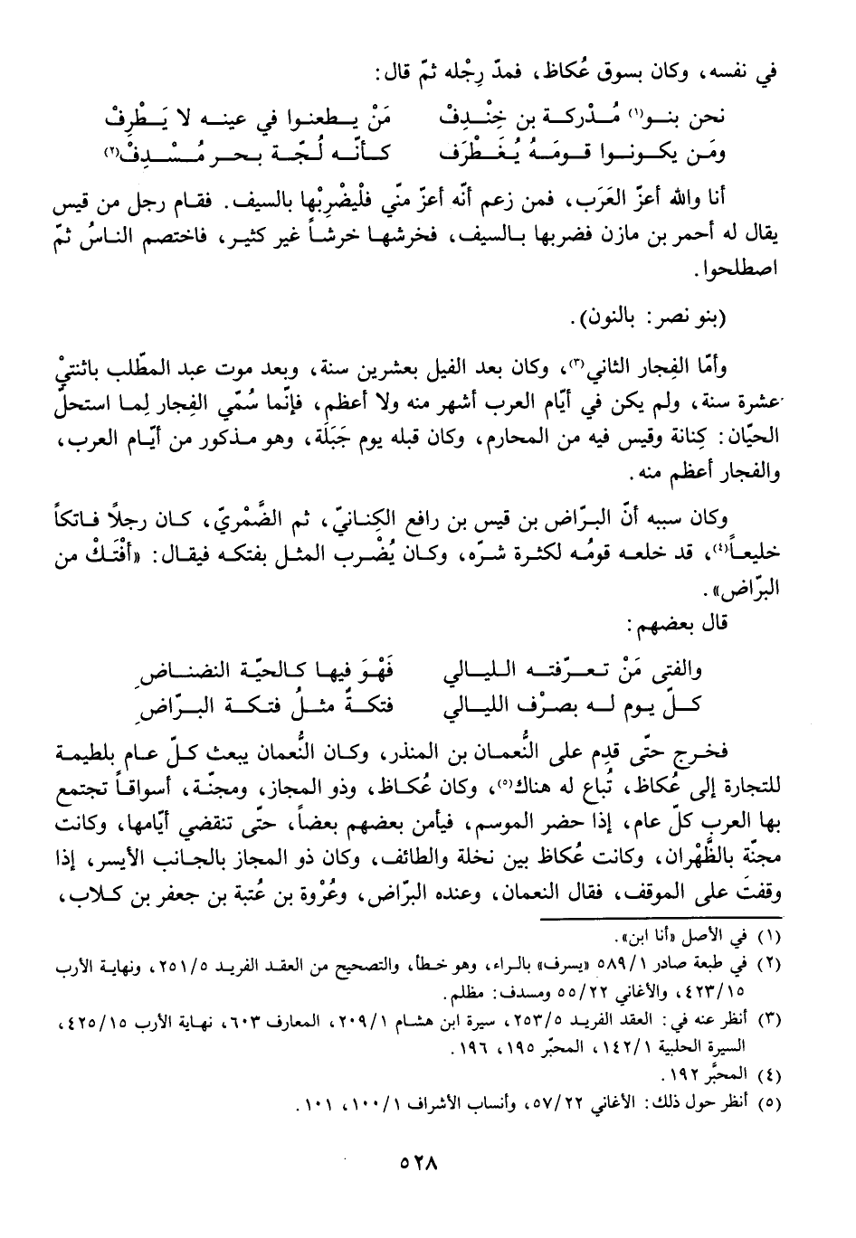 فَخَرَجَ حَتَّى قَدِمَ عَلَى النُّعْمَانِ بْنِ الْمُنْذِرِ، وَكَانَ النُّعْمَانُ يَبْعَثُ كُلَّ عَامٍ بِلَطِيمَةٍ لِلتِّجَارَةِ إِلَى عُكَاظَ تُبَاعُ لَهُ هُنَاكَ، وَكَانَ عُكَاظُ وَذُو الْمَجَازِ وَمَجَنَّةُ أَسْوَاقًا تَجْتَمِعُ بِهَا الْعَرَبُ كُلَّ عَامٍ إِذَا حَضَرَ الْمَوْسِمُ، فَيَأْمَنُ بَعْضُهُمْ بَعْضًا حَتَّى تَنْقَضِيَ أَيَّامُهَا، وَكَانَتْ مَجَنَّةُ بِالظَّهْرَانِ، وَكَانَتْ عُكَاظُ بَيْنَ نَخْلَةَ وَالطَّائِفِ، وَكَانَ ذُو الْمَجَازِ بِالْجَانِبِ الْأَيْسَرِ إِذَا وَقَفْتَ عَلَى الْمَوْقِفِ، فَقَالَ النُّعْمَانُ، وَعِنْدَهُ الْبَرَّاضُ وَعُرْوَةُ بْنُ عُتْبَةَ بْنِ جَعْفَرِ بْنِ كِلَابٍ
