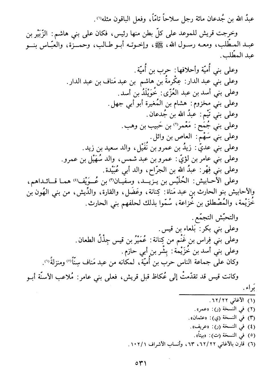 وَخَرَجَتْ قُرَيْشٌ لِلْمَوْعِدِ، عَلَى كُلِّ بَطْنٍ مِنْهَا رَئِيسٌ، فَكَانَ عَلَى بَنِي هَاشِمٍ: الزُّبَيْرُ بْنُ عَبْدِ الْمُطَّلِبِ وَمَعَهُ رَسُولُ اللَّهِ - صَلَّى اللَّهُ عَلَيْهِ وَسَلَّمَ - وَإِخْوَتُهُ أَبُو طَالِبٍ وَحَمْزَةُ وَالْعَبَّاسُ بَنُو عَبْدِ الْمُطَّلِبِ. وَعَلَى بَنِي أُمَيَّةَ وَأَحْلَافِهَا: حَرْبُ بْنُ أُمَيَّةَ. وَعَلَى بَنِي عَبْدِ الدَّارِ: عِكْرِمَةُ بْنُ هَاشِمِ بْنِ عَبْدِ مَنَافِ بْنِ عَبْدِ الدَّارِ. وَعَلَى بَنِي أَسَدِ بْنِ عَبْدِ الْعُزَّى: خُوَيْلِدُ بْنُ أَسَدٍ. وَعَلَى بَنِي مَخْزُومٍ: هِشَامُ بْنُ الْمُغِيرَةِ أَبُو أَبِي جَهْلٍ. وَعَلَى بَنِي تَيْمٍ: عَبْدُ اللَّهِ بْنُ جُدْعَانَ. وَعَلَى بَنِي جُمَحَ: مَعْمَرُ بْنُ حَبِيبِ بْنِ وَهْبٍ. وَعَلَى بَنِي سَهْمٍ: الْعَاصُ بْنُ وَائِلٍ. وَعَلَى بَنِي عَدِيٍّ: زَيْدُ بْنُ عَمْرِو بْنِ نُفَيْلٍ وَالِدُ سَعِيدِ بْنِ زَيْدٍ. وَعَلَى بَنِي عَامِرِ بْنِ لُؤَيٍّ: عَمْرُو بْنُ عَبْدِ شَمْسٍ وَالِدُ سُهَيْلِ بْنِ عَمْرٍو. وَعَلَى بَنِي فِهْرٍ: عَبْدُ اللَّهِ بْنُ الْجَرَّاحِ وَالِدُ أَبِي عُبَيْدَةَ. وَعَلَى الْأَحَابِيشِ: الْحُلَيْسُ بْنُ يَزِيدَ وَسُفْيَانُ بْنُ عُوَيْفٍ هُمَا قَائِدَاهُمْ، وَالْأَحَابِيشُ بَنُو الْحَارِثِ بْنِ عَبْدِ مَنَاةَ: كِنَانَةُ وَعَضَلُ وَالْقَارَةُ وَالدِّيشُ مِنْ بَنِي الْهُونِ بْنِ خُزَيْمَةَ وَالْمُصْطَلِقِ بْنِ خُزَاعَةَ، وَسُمُّوا بِذَلِكَ لِحَلِفِهِمْ بَنِي الْحَارِثِ، وَالتَّحَبُّشُ التَّجَمُّعُ. وَعَلَى بَنِي بَكْرٍ: بَلْعَاءُ بْنُ قَيْسٍ. وَعَلَى بَنِي فِرَاسِ بْنِ غَنْمٍ مِنْ كِنَانَةَ: عُمَيْرُ بْنُ قَيْسٍ جِذْلُ الطِّعَانِ. وَعَلَى بَنِي أَسَدِ بْنِ خُزَيْمَةَ: بِشْرُ بْنُ أَبِي حَازِمٍ. وَكَانَ عَلَى جَمَاعَةِ النَّاسِ حَرْبُ بْنُ أُمَيَّةَ لِمَكَانِهِ مِنْ عَبْدِ مَنَافٍ سِنًّا وَمَنْزِلَةً.