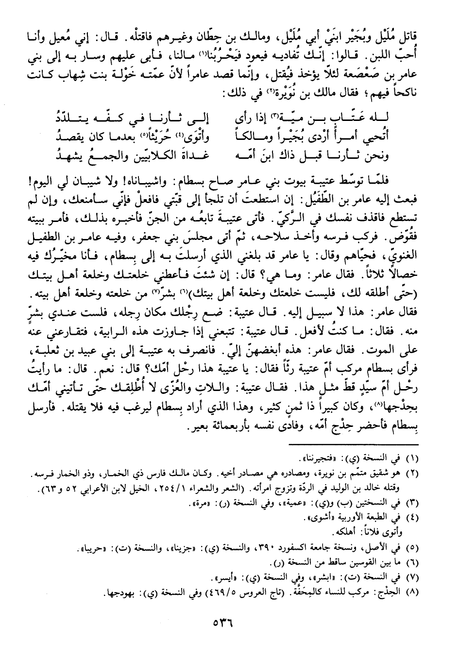فَلَمَّا تَوَسَّطَ عُتَيْبَةُ بُيُوتَ بَنِي عَامِرٍ صَاحَ بِسْطَامٌ: وَا شَيْبَانَاهُ! وَلَا شَيْبَانَ لِيَ الْيَوْمَ! فَبَعَثَ إِلَيْهِ عَامِرُ بْنُ الطُّفَيْلِ: إِنِ اسْتَطَعْتَ أَنْ تَلْجَأَ إِلَى قُبَّتِي فَافْعَلْ فَإِنِّي سَأَمْنَعُكَ، وَإِنْ لَمْ تَسْتَطِعْ فَاقْذِفْ نَفْسَكَ فِي الرَّكِيِّ. فَأَتَى عُتَيْبَةُ تَابِعَهُ مِنَ الْجِنِّ فَأَخْبَرَهُ بِذَلِكَ، فَأَمَرَ بِبَيْتِهِ فَقُوِّضَ. فَرَكِبَ فَرَسَهُ وَأَخَذَ سِلَاحَهُ ثُمَّ أَتَى مَجْلِسَ بَنِي جَعْفَرٍ، وَفِيهِ عَامِرُ بْنُ الطُّفَيْلِ الْغَنَوِيُّ، فَحَيَّاهُمْ وَقَالَ: يَا عَامِرُ قَدْ بَلَغَنِي الَّذِي أَرْسَلْتَ بِهِ إِلَى بِسْطَامٍ فَأَنَا مُخَيِّرُكَ فِيهِ خِصَالًا ثَلَاثًا. فَقَالَ عَامِرٌ: وَمَا هِيَ؟ قَالَ: إِنْ شِئْتَ فَأَعْطِنِي خَلْعَتَكَ وَخَلْعَةَ أَهْلِ بَيْتِكَ حَتَّى أُطْلِقَهُ لَكَ، فَلَيْسَتْ خَلَعَتُكَ وَخَلْعَةُ أَهْلِ بَيْتِكَ بِشَرٍّ مِنْ خَلْعَتِهِ وَخَلْعَةِ أَهْلِ بَيْتِهِ. فَقَالَ عَامِرٌ: هَذَا لَا سَبِيلَ إِلَيْهِ. قَالَ عُتَيْبَةُ: ضَعْ رِجْلَكَ مَكَانَ رِجْلِهِ فَلَسْتَ عِنْدِي بِشَرٍّ مِنْهُ. فَقَالَ: مَا كُنْتُ لِأَفْعَلَ. قَالَ عُتَيْبَةُ: تَتْبَعُنِي إِذَا جَاوَزْتُ هَذِهِ الرَّابِيَةَ فَتُقَارِعُنِي عَنْهُ عَلَى الْمَوْتِ. فَقَالَ عَامِرٌ: هَذِهِ أَبْغَضُهُنَّ إِلَيَّ. فَانْصَرَفَ بِهِ عُتَيْبَةُ إِلَى بَنِي عُبَيْدِ بْنِ ثَعْلَبَةَ فَرَأَى بِسْطَامٌ مَرْكَبَ أُمِّ عُتَيْبَةَ رَثًّا فَقَالَ: يَا عُتَيْبَةُ هَذَا رَحْلُ أُمِّكَ؟ قَالَ: نَعَمْ. قَالَ: مَا رَأَيْتُ رَحْلَ أُمِّ سَيِّدٍ قَطُّ مِثْلَ هَذَا. فَقَالَ عُتَيْبَةُ: وَاللَّاتِ وَالْعُزَّى لَا أُطْلِقُكَ حَتَّى تَأْتِنِي أُمُّكَ بِحِدْجِهَا، وَكَانَ كَبِيرًا ذَا ثَمَنٍ كَثِيرٍ، وَهَذَا الَّذِي أَرَادَ بِسْطَامٌ لِيَرْغَبَ فِيهِ فَلَا يَقْتُلَهُ. فَأَرْسَلَ بِسْطَامٌ فَأَحْضَرَ حِدْجَ أُمِّهِ وَفَادَى نَفْسَهُ بِأَرْبَعِمِائَةِ بَعِيرٍ،
