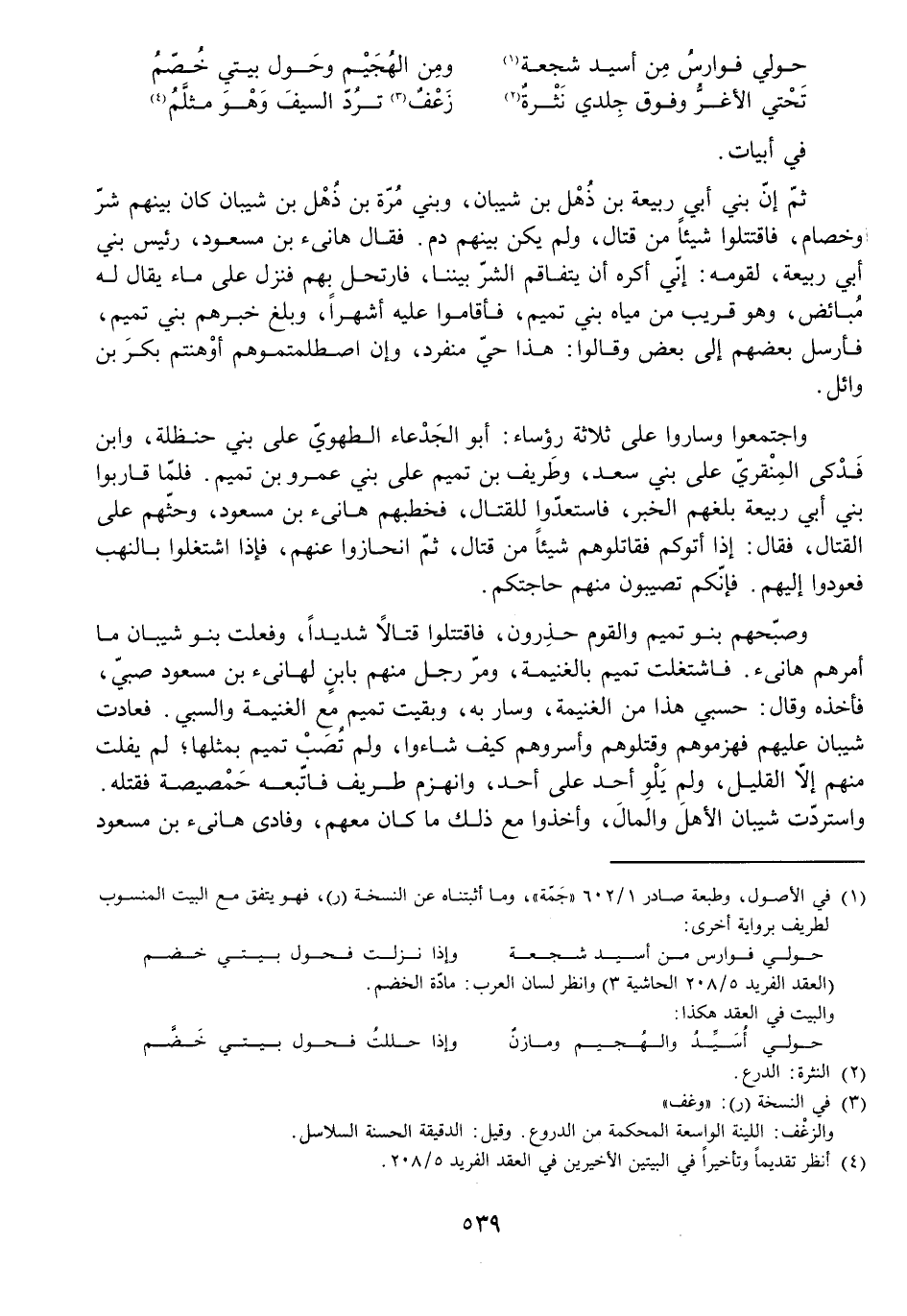 ثُمَّ إِنَّ بَنِي أَبِي رَبِيعَةَ بْنِ ذُهْلِ بْنِ شَيْبَانَ وَبَنِي مُرَّةَ بْنِ ذُهْلِ بْنِ شَيْبَانَ كَانَ بَيْنَهُمْ شَرٌّ وَخِصَامٌ فَاقْتَتَلُوا شَيْئًا مِنْ قِتَالٍ، وَلَمْ يَكُنْ بَيْنَهُمْ دَمٌ. فَقَالَ هَانِئُ بْنُ مَسْعُودٍ، رَئِيسُ بَنِي أَبِي رَبِيعَةَ، لِقَوْمِهِ: إِنِّي أَكْرَهُ أَنْ يَتَفَاقَمَ الشَّرُّ بَيْنَنَا، فَارْتَحَلَ بِهِمْ فَنَزَلَ عَلَى مَاءٍ يُقَالُ لَهُ مَبَائِضُ، وَهُوَ قَرِيبٌ مِنْ مِيَاهِ بَنِي تَمِيمٍ، فَأَقَامُوا عَلَيْهِ أَشْهُرًا، وَبَلَغَ خَبَرُهُمْ بَنِي تَمِيمٍ، فَأَرْسَلَ بَعْضُهُمْ إِلَى بَعْضٍ وَقَالُوا: هَذَا حَيٌّ مُنْفَرِدٌ وَإِنِ اصْطَلَمْتُمُوهُمْ أَوْهَنْتُمْ بَكْرَ بْنَ وَائِلٍ.