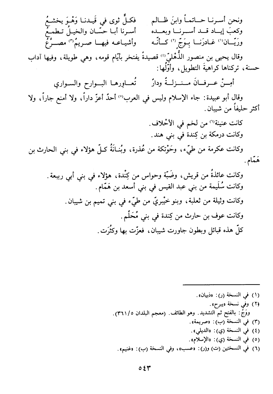 وَقَالَ يَحْيَى بْنُ مَنْصُورٍ الذُّهْلِيُّ قَصِيدَةً يَفْتَخِرُ بِأَيَّامِ قَوْمِهِ، وَهِيَ طَوِيلَةٌ، وَفِيهَا آدَابٌ حَسَنَةٌ، تَرَكْنَاهَا كَرَاهِيَةَ التَّطْوِيلِ، وَأَوَّلُهَا: