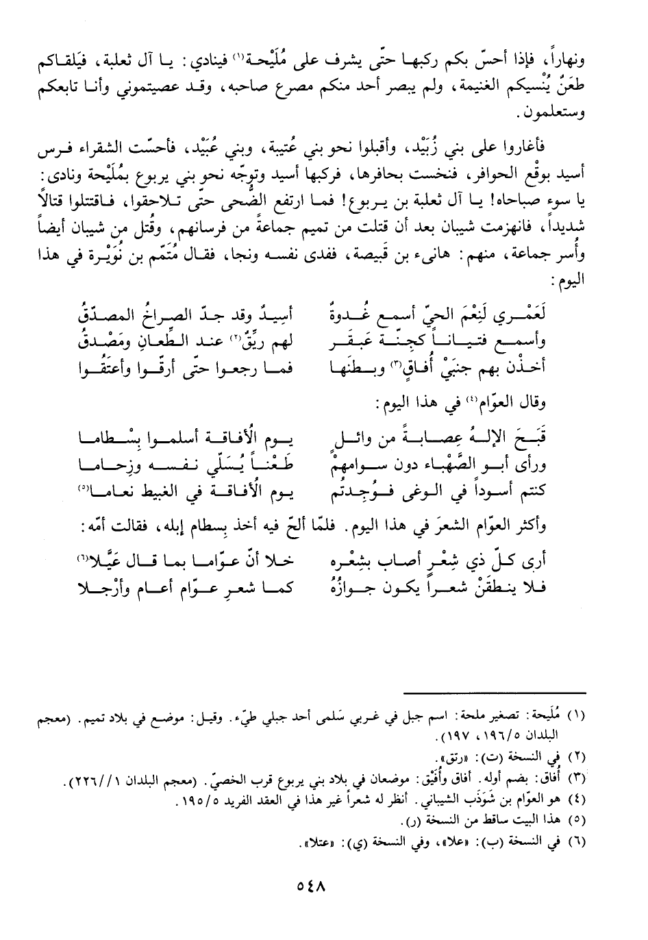 فَأَغَارُوا عَلَى بَنِي زُبَيْدٍ، وَأَقْبَلُوا نَحْوَ بَنِي عُتَيْبَةَ وَبَنِي عُبَيْدٍ، فَأَحَسَّتِ الشَّقْرَاءُ فَرَسُ أُسَيْدٍ بِوَقْعِ الْحَوَافِرِ فَنَخَسَتْ بِحَافِرِهَا، فَرَكِبَهَا أُسَيْدٌ وَتَوَجَّهَ نَحْوَ بَنِي يَرْبُوعٍ بِمُلَيْحَةَ وَنَادَى: يَا سُوءَ صَبَاحَاهُ! يَا آلَ ثَعْلَبَةَ بْنِ يَرْبُوعٍ! فَمَا ارْتَفَعَ الضُّحَى حَتَّى تَلَاحَقُوا فَاقْتَتَلُوا قِتَالًا شَدِيدًا، فَانْهَزَمَتْ شَيْبَانُ بَعْدَ أَنْ قَتَلَتْ مِنْ تَمِيمٍ جَمَاعَةً مِنْ فُرْسَانِهِمْ، وَقُتِلَ مِنْ شَيْبَانَ أَيْضًا وَأُسِرَ جَمَاعَةٌ، مِنْهُمْ: هَانِئُ بْنُ قَبِيصَةَ، فَفَدَى نَفْسَهُ وَنَجَا، فَقَالَ مُتَمِّمُ بْنُ نُوَيْرَةَ فِي هَذَا الْيَوْمِ: