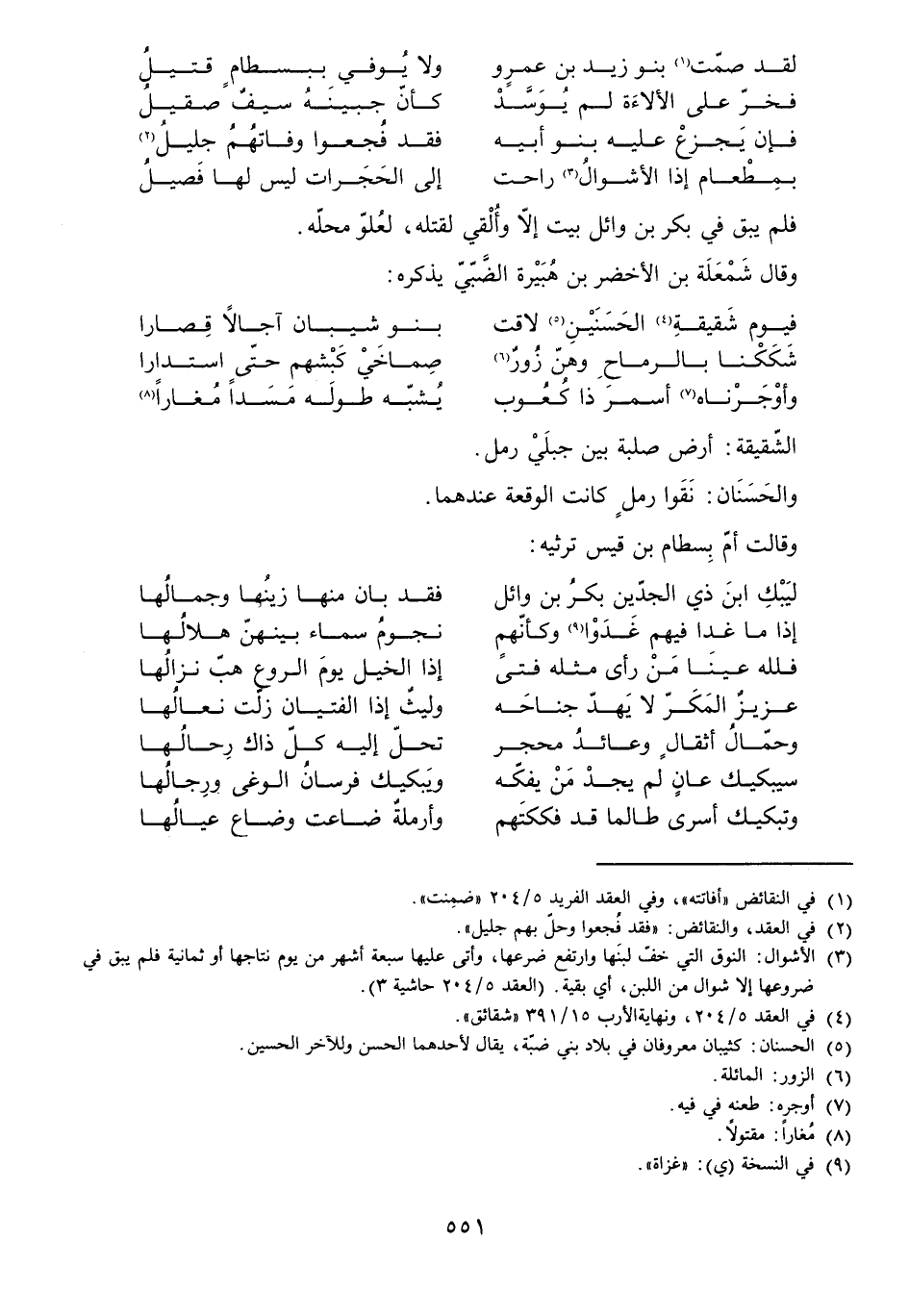 فَيَوْمُ شَقِيقَةِ الْحَسَنَيْنِ لَاقَتْ ... بَنُو شَيْبَانَ آجَالًا قِصَارَا