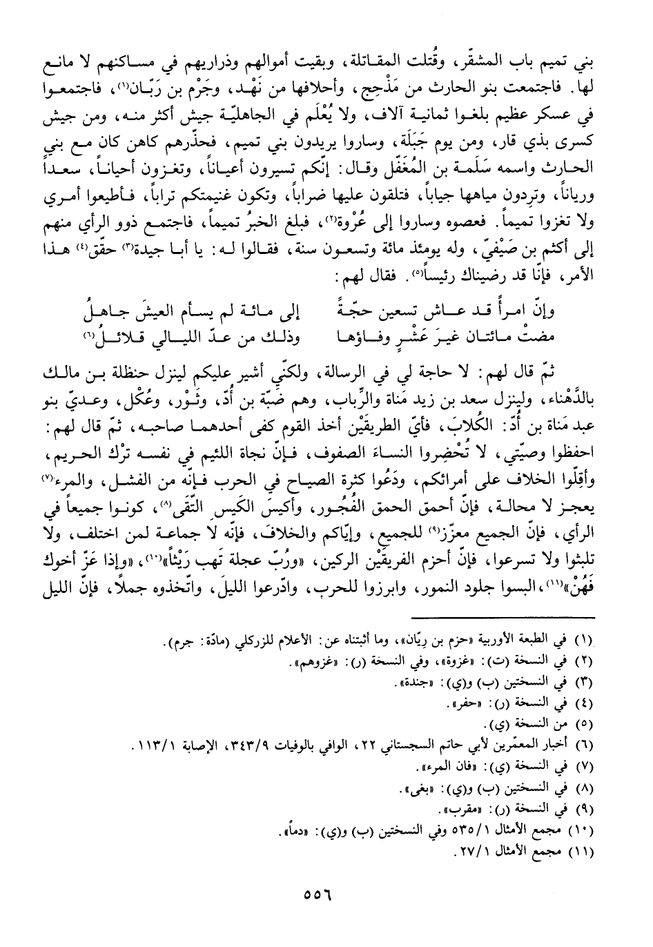 بَنِي تَمِيمٍ بَابُ الْمُشَقَّرِ، وَقُتِلَتِ الْمُقَاتِلَةُ وَبَقِيَتْ أَمْوَالُهُمْ وَذَرَارِيهِمْ فِي مَسَاكِنِهِمْ لَا مَانِعَ لَهَا. فَاجْتَمَعَتْ بَنُو الْحَارِثِ فِي مَذْحِجٍ، وَأَحْلَافِهَا مِنْ نَهْدٍ وَجَرْمِ بْنِ رَبَّانَ، فَاجْتَمَعُوا فِي عَسْكَرٍ عَظِيمٍ بَلَغُوا ثَمَانِيَةَ آلَافٍ، وَلَا يُعْلَمُ فِي الْجَاهِلِيَّةِ جَيْشٌ أَكْثَرُ مِنْهُ وَمِنْ جَيْشِ كِسْرَى بِذِي قَارٍ وَمِنْ يَوْمِ جَبَلَةَ، وَسَارُوا يُرِيدُونَ بَنِي تَمِيمٍ، فَحَذَّرَهُمْ كَاهِنٌ كَانَ مَعَ بَنِي الْحَارِثِ وَاسْمُهُ سَلَمَةُ بْنُ الْمُغَفَّلِ وَقَالَ: إِنَّكُمْ تَسِيرُونَ أَعْيَانًا، وَتَغْزُونَ أَحْيَانًا، سَعْدًا وَرَيَّانًا، وَتَرِدُونَ مِيَاهَهَا جِيَابًا، فَتَلْقُونَ عَلَيْهَا ضِرَابًا، وَتَكُونُ غَنِيمَتُكُمْ تُرَابًا، فَأَطِيعُوا أَمْرِي وَلَا تَغْزُوا تَمِيمًا. فَعَصَوْهُ وَسَارُوا إِلَى عُرْوَةَ، فَبَلَغَ الْخَبَرُ تَمِيمًا. فَاجْتَمَعَ ذَوُو الرَّأْيِ مِنْهُمْ إِلَى أَكْثَمَ بْنِ صَيْفِيٍّ، وَلَهُ يَوْمَئِذٍ مِائَةٌ وَتِسْعُونَ سَنَةً، فَقَالُوا لَهُ: يَا أَبَا جِيدَةَ حَقِّقْ هَذَا الْأَمْرَ فَإِنَّا قَدْ رَضِينَاكَ رَئِيسًا. فَقَالَ لَهُمْ: