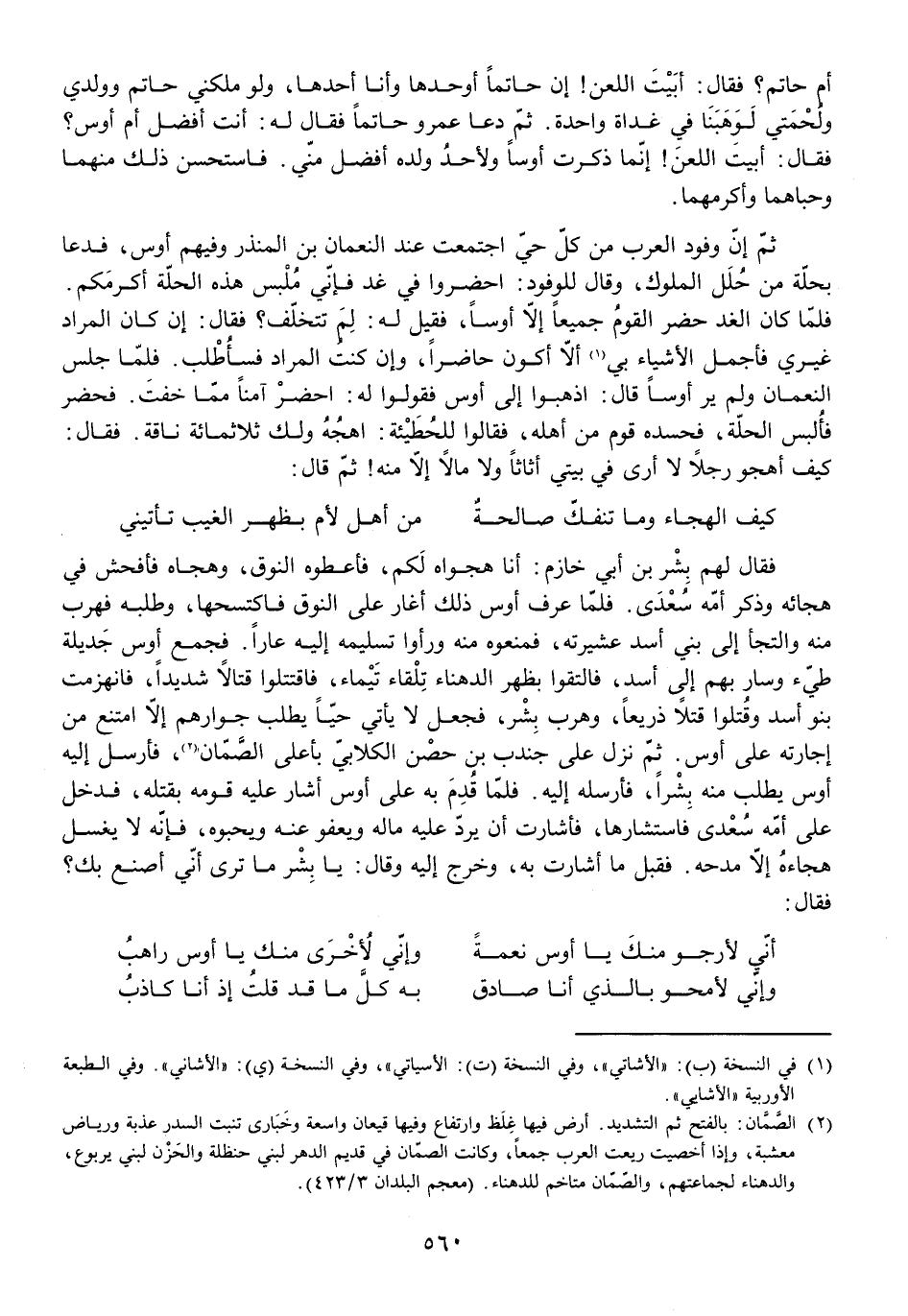 أَمْ حَاتِمٌ؟ فَقَالَ: أَبَيْتَ اللَّعْنَ! إِنَّ حَاتِمًا أَوْحَدُهَا وَأَنَا أَحَدُهَا، وَلَوْ مَلَكَنِي حَاتِمٌ وَوَلَدِي وَلُحْمَتِي لَوَهَبَنَا فِي غَدَاةٍ وَاحِدَةٍ. ثُمَّ دَعَا عَمْرٌو حَاتِمًا فَقَالَ لَهُ: أَنْتَ أَفْضَلُ أَمْ أَوْسٌ؟ فَقَالَ: أَبَيْتَ اللَّعْنَ! إِنَّمَا ذَكَرْتَ أَوْسًا وَلَأَحَدُ وَلَدِهِ أَفْضَلُ مِنِّي. فَاسْتَحْسَنَ ذَلِكَ مِنْهُمَا وَحَبَاهُمَا وَأَكْرَمَهُمَا.