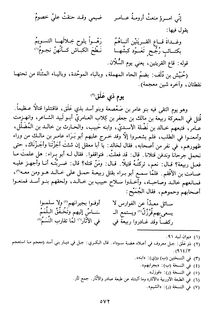 وَهُوَ يَوْمٌ الْتَقَى فِيهِ بَنُو عَامِرِ بْنِ صَعْصَعَةَ وَبَنُو أَسَدٍ بِذِي عَلَقٍ فَاقْتَتَلُوا اقْتِتَالًا شَدِيدًا عَظِيمًا. قُتِلَ فِي الْمَعْرَكَةِ رَبِيعَةُ بْنُ مَالِكِ بْنِ جَعْفَرِ بْنِ كُلَابٍ الْعَامِرِيُّ أَبُو لَبِيدٍ الشَّاعِرِ وَانْهَزَمَتْ عَامِرٌ، فَتَبِعَهُمْ خَالِدُ بْنُ نَضْلَةَ الْأَسَدِيُّ وَابْنُهُ حَبِيبٌ وَالْحَارِثُ بْنُ خَالِدِ بْنِ الْمُضَلِّلِ، وَأَمْعَنُوا فِي الطَّلَبِ، فَلَمْ يَشْعُرُوا إِلَّا وَقَدْ خَرَجَ عَلَيْهِمْ أَبُو بَرَاءٍ عَامِرُ بْنُ مَالِكٍ مِنْ وَرَاءِ ظُهُورِهِمْ فِي نَفَرٍ مِنْ أَصْحَابِهِ، فَقَالَ لِخَالِدٍ: يَا أَبَا مَعْقِلٍ إِنْ شِئْتَ أَجَزْتَنَا وَأَجَزْنَاكَ حَتَّى نَحْمِلَ جَرْحَانَا وَنَدْفِنَ قَتْلَانَا. قَالَ: قَدْ فَعَلْتُ. فَتَوَاقَفُوا. فَقَالَ لَهُ أَبُو بَرَاءٍ: هَلْ عَلِمْتَ مَا فَعَلَ رَبِيعَةُ؟ قَالَ: نَعَمْ تَرَكْتُهُ قَتِيلًا. قَالَ: وَمَنْ قَتَلَهُ؟ قَالَ: ضَرَبْتُهُ أَنَا وَأَجْهَزَ عَلَيْهِ صَامِتُ بْنُ الْأَفْقَمِ. فَلَمَّا سَمِعَ أَبُو بَرَاءٍ بِقَتْلِ رَبِيعَةَ حَمَلَ عَلَى خَالِدٍ هُوَ وَمَنْ مَعَهُ، فَمَانَعَهُمْ خَالِدٌ وَصَاحِبَاهُ وَأَخَذُوا سِلَاحَ حَبِيبِ بْنِ خَالِدٍ، وَلَحِقَهُمْ بَنُو أَسَدٍ فَمَنَعُوا أَصْحَابَهُمْ وَحَمُوهُمْ، فَقَالَ الْجُمَيْحُ: