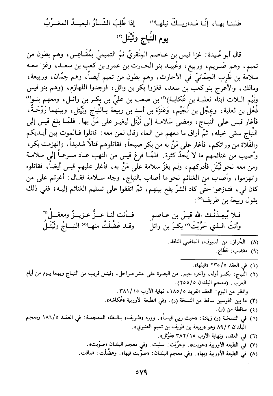 قَالَ أَبُو عُبَيْدَةَ: غَزَا قَيْسُ بْنُ عَاصِمٍ الْمِنْقَرِيُّ ثُمَّ التَّمِيمِيُّ بِمُقَاعِسَ، وَهُمْ بُطُونٌ مِنْ تَمِيمٍ، وَهُمْ صَرِيمٌ وَرَبِيعٌ وَعُبَيْدٌ بَنُو الْحَارِثِ بْنِ عَمْرِو بْنِ كَعْبِ بْنِ سَعْدٍ، وَغَزَا مَعَهُ سَلَامَةُ بْنُ ظَرِبٍ الْحِمَّانِيُّ فِي الْحَارِثِ، وَهُمْ بُطُونٌ مِنْ تَمِيمٍ أَيْضًا، وَهُمْ حِمَّانُ وَرَبِيعَةُ وَمَالِكٌ وَالْأَعْرَجُ بَنُو كَعْبِ بْنِ سَعْدٍ، فَغَزَوْا بَكْرَ بْنَ وَائِلٍ، فَوَجَدُوا اللَّهَازِمَ، وَهُمْ بَنُو قَيْسٍ وَتَيْمُ اللَّاتِ أَبْنَاءُ ثَعْلَبَةَ بْنِ عُكَابَةَ بْنِ صَعْبِ بْنِ عَلِيِّ بْنِ بَكْرِ بْنِ وَائِلٍ، وَمَعَهُمْ بَنُو ذُهْلِ بْنِ ثَعْلَبَةَ وَعِجْلُ بْنُ لُجَيْمٍ وَعَنَزَةُ بْنُ أَسَدِ بْنِ رَبِيعَةَ بِالنِّبَاجِ وَثَيْتَلٍ، وَبَيْنَهُمَا رَوْحَةٌ، فَأَغَارَ قَيْسٌ عَلَى النِّبَاجِ، وَمَضَى سَلَامَةُ إِلَى ثَيْتَلٍ لِيُغِيرَ عَلَى مَنْ بِهَا. فَلَمَّا بَلَغَ قَيْسٌ إِلَى النِّبَاجِ سَقَى خَيْلَهُ ثُمَّ أَرَاقَ مَا مَعَهُمْ مِنَ الْمَاءِ وَقَالَ لِمَنْ مَعَهُ: قَاتِلُوا فَالْمَوْتُ بَيْنَ أَيْدِيكُمْ وَالْفَلَاةُ مِنْ وَرَائِكُمْ، فَأَغَارَ عَلَى مَنْ بِهِ مِنْ بَكْرٍ صُبْحًا، فَقَاتَلُوهُمْ قِتَالًا شَدِيدًا، وَانْهَزَمَتْ بَكْرٌ وَأُصِيبَ مِنْ غَنَائِمِهِمْ مَا لَا يُحَدُّ كَثْرَةً. فَلَمَّا فَرَغَ قَيْسٌ مِنَ النَّهْبِ عَادَ مُسْرِعًا إِلَى سَلَامَةَ وَمَنْ مَعَهُ نَحْوَ ثَيْتَلٍ فَأَدْرَكَهُمْ، وَلَمْ يَغْزُ سَلَامَةُ عَلَى مَنْ بِهِ، فَأَغَارَ عَلَيْهِمْ قَيْسٌ أَيْضًا، فَقَاتَلُوهُ وَانْهَزَمُوا، وَأَصَابَ مِنَ الْغَنَائِمِ نَحْوَ مَا أَصَابَ بِالنِّبَاجِ، وَجَاءَ سَلَامَةُ فَقَالَ: أَغَرْتُمْ عَلَى مَنْ كَانَ لِي، فَتَنَازَعُوا حَتَّى كَادَ الشَّرُّ يَقَعُ بَيْنَهُمْ، ثُمَّ اتَّفَقُوا عَلَى تَسْلِيمِ الْغَنَائِمِ إِلَيْهِ، فَفِي ذَلِكَ يَقُولُ رَبِيعَةُ بْنُ طَرِيفٍ: