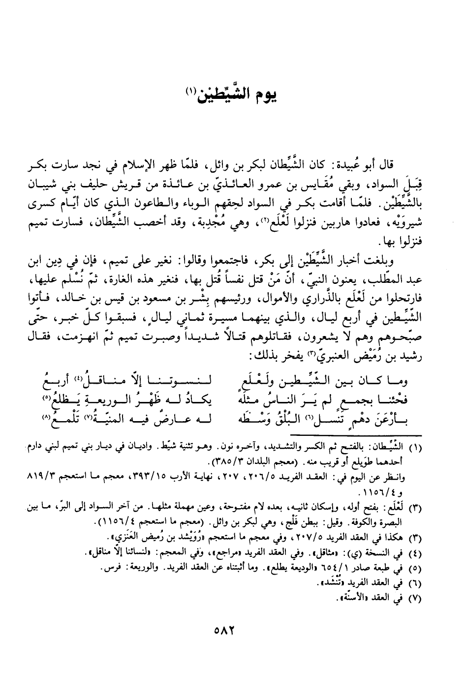 وَبَلَغَتْ أَخْبَارُ الشَّيِّطَيْنِ إِلَى بَكْرٍ فَاجْتَمَعُوا وَقَالُوا: نُغِيرُ عَلَى تَمِيمٍ، فَإِنَّ فِي دِينِ ابْنِ عَبْدِ الْمُطَّلِبِ، يَعْنُونَ النَّبِيَّ، أَنَّ مَنْ قَتَلَ نَفْسًا قُتِلَ بِهَا، فَنُغِيرُ هَذِهِ الْغَارَةَ ثُمَّ نُسْلِمُ عَلَيْهَا، فَارْتَحَلُوا مِنْ لَعْلَعَ بِالذَّرَارِيِّ وَالْأَمْوَالِ وَرَئِيسُهُمْ بِشْرُ بْنُ مَسْعُودِ بْنِ قَيْسِ بْنِ خَالِدٍ، فَأَتَوُا الشَّيِّطَيْنِ فِي أَرْبَعِ لَيَالٍ، وَالَّذِي بَيْنَهُمَا مَسِيرَةُ ثَمَانِي لَيَالٍ، فَسَبَقُوا كُلَّ خَبَرٍ حَتَّى صَبَّحُوهُمْ وَهُمْ لَا يَشْعُرُونَ فَقَاتَلُوهُمْ قِتَالًا شَدِيدًا وَصَبَرَتْ تَمِيمٌ ثُمَّ انْهَزَمَتْ، فَقَالَ رَشِيدُ بْنُ رُمَيْضٍ الْعَنْبَرِيُّ يَفْخَرُ بِذَلِكَ: