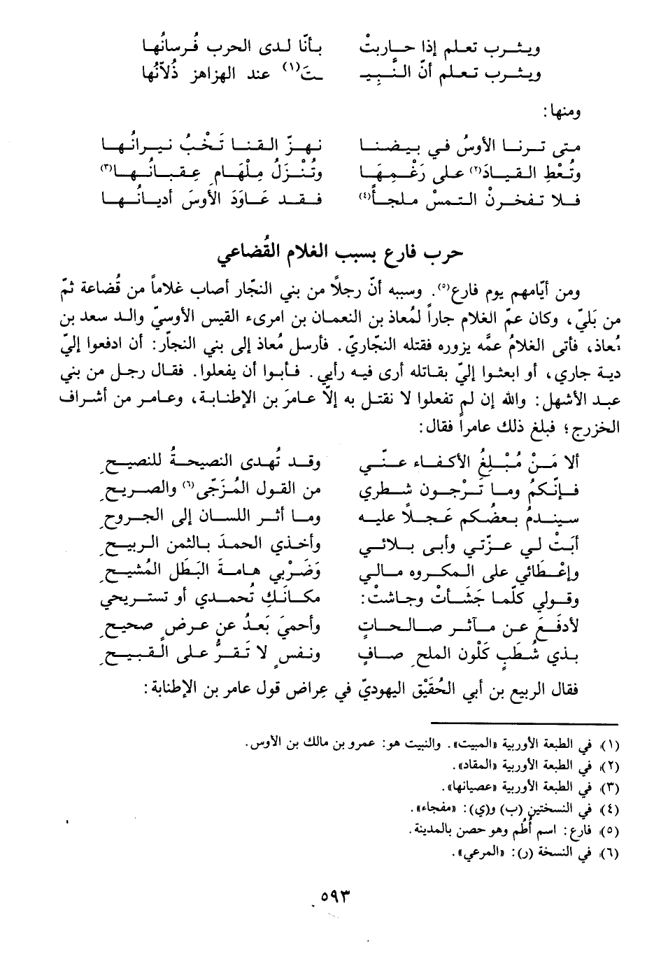 وَمِنْ أَيَّامِهِمْ يَوْمُ فَارِعٍ. وَسَبَبُهُ أَنَّ رَجُلًا مِنْ بَنِي النَّجَّارِ أَصَابَ غُلَامًا مِنْ قُضَاعَةَ ثُمَّ مِنْ بَلِيٍّ، وَكَانَ عَمُّ الْغُلَامِ جَارًا لِمُعَاذِ بْنِ النُّعْمَانِ بْنِ امْرِئِ الْقَيْسِ الْأَوْسِيِّ وَالِدِ سَعْدِ بْنِ مُعَاذٍ، فَأَتَى الْغُلَامُ عَمَّهُ يَزُورُهُ فَقَتَلَهُ النَّجَّارِيُّ. فَأَرْسَلَ مُعَاذٌ إِلَى بَنِي النَّجَّارِ: أَنِ ادْفَعُوا إِلَيَّ دِيَةَ جَارِي أَوِ ابْعَثُوا إِلَيَّ بِقَاتِلِهِ أَرَى فِيهِ رَأْيِي. فَأَبَوْا أَنْ يَفْعَلُوا. فَقَالَ رَجُلٌ مِنْ بَنِي عَبْدِ الْأَشْهَلِ: وَاللَّهِ إِنْ لَمْ تَفْعَلُوا لَا نَقْتُلُ بِهِ إِلَّا عَامِرَ بْنَ الْإِطْنَابَةِ، وَعَامِرٌ مِنْ أَشْرَافِ الْخَزْرَجِ، فَبَلَغَ ذَلِكَ عَامِرًا فَقَالَ: