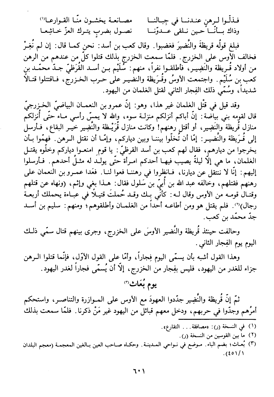 وَقَدْ قِيلَ فِي قَتْلِ الْغِلْمَانِ غَيْرُ هَذَا، وَهُوَ: إِنَّ عَمْرَو بْنَ النُّعْمَانِ الْبَيَاضِيَّ الْخَزْرَجِيَّ قَالَ لِقَوْمِهِ بَنِي بَيَاضَةَ: إِنَّ أَبَاكُمْ أَنْزَلَكُمْ مَنْزِلَةَ سُوءٍ، وَاللَّهِ لَا يَمَسُّ رَأْسِي مَاءٌ حَتَّى أُنْزِلَكُمْ مَنَازِلَ قُرَيْظَةَ وَالنَّضِيرِ أَوْ أَقْتُلَ رَهْنَهُمْ! وَكَانَتْ مَنَازِلُ قُرَيْظَةَ وَالنَّضِيرِ خَيْرَ الْبِقَاعِ، فَأَرْسَلَ إِلَى قُرَيْظَةَ وَالنَّضِيرِ: إِمَّا أَنْ تُخَلُّوا بَيْنَنَا وَبَيْنَ دِيَارِكُمْ، وَإِمَّا أَنْ نَقْتُلَ الرَّهْنَ. فَهَمُّوا بِأَنْ يَخْرُجُوا مِنْ دِيَارِهِمْ، فَقَالَ لَهُمْ كَعْبُ بْنُ أَسَدٍ الْقُرَظِيُّ: يَا قَوْمُ امْنَعُوا دِيَارَكُمْ وَخَلُّوهُ يَقْتُلُ الْغِلْمَانَ، مَا هِيَ إِلَّا لَيْلَةٌ يُصِيبُ فِيهَا أَحَدُكُمُ امْرَأَةً حَتَّى يُولَدَ لَهُ مِثْلُ أَحَدِهِمْ. فَأَرْسَلُوا إِلَيْهِمْ: إِنَّا لَا نَنْتَقِلُ عَنْ دِيَارِنَا فَانْظُرُوا فِي رَهْنِنَا فَعُوا لَنَا. فَعَدَا عَمْرُو بْنُ النُّعْمَانِ عَلَى رَهْنِهِمْ فَقَتَلَهُمْ، وَخَالَفَهُ عَبْدُ اللَّهِ بْنُ أُبَيِّ بْنِ سَلُولٍ فَقَالَ: هَذَا بَغْيٌ وَإِثْمٌ، وَنَهَاهُ عَنْ قَتْلِهِمْ وَقِتَالِ قَوْمِهِ مِنَ الْأَوْسِ وَقَالَ لَهُ: كَأَنِّي بِكَ وَقَدْ حُمِلْتَ قَتِيلًا فِي عَبَاءَةٍ يَحْمِلُكَ أَرْبَعَةُ رِجَالٍ. فَلَمْ يَقْتُلْ هُوَ وَمَنْ أَطَاعَهُ أَحَدًا مِنَ الْغِلْمَانِ وَأَطْلَقُوهُمْ، وَمِنْهُمْ: سُلَيْمُ بْنُ أَسَدٍ جَدُّ مُحَمَّدِ بْنِ كَعْبٍ. وَحَالَفَتْ حِينَئِذٍ قُرَيْظَةُ وَالنَّضِيرُ وَالْأَوْسُ عَلَى الْخَزْرَجِ، وَجَرَى بَيْنَهُمْ قِتَالٌ سُمِّيَ ذَلِكَ الْيَوْمُ يَوْمَ الْفِجَارِ الثَّانِي. وَهَذَا الْقَوْلُ أَشْبَهُ بِأَنْ يُسَمَّى الْيَوْمَ فِجَارًا، وَأَمَّا عَلَى الْقَوْلِ الْأَوَّلِ فَإِنَّمَا قَتَلُوا الرَّهْنَ جَزَاءَ الْغَدْرِ مِنَ الْيَهُودِ فَلَيْسَ بِفِجَارٍ مِنَ الْخَزْرَجِ إِلَّا أَنْ يُسَمَّى فِجَارًا لِغَدْرِ الْيَهُودِ.