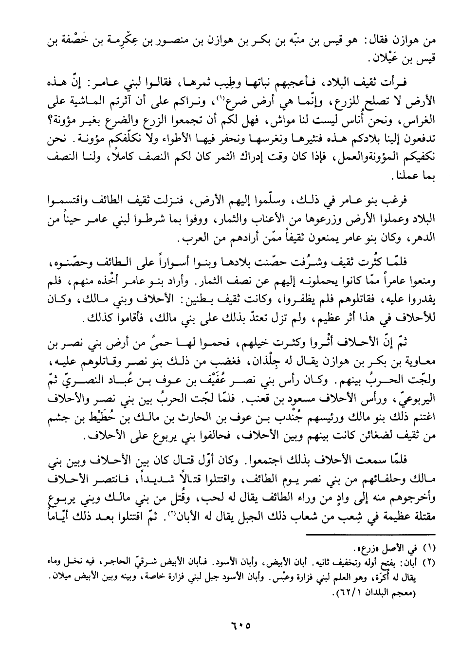 فَلَمَّا كَثُرَتْ ثَقِيفٌ وَشَرُفَتْ حَصَّنَتْ بِلَادَهَا وَبَنَوْا أَسْوَارًا عَلَى الطَّائِفِ وَحَصَّنُوهُ، وَمَنَعُوا عَامِرًا مِمَّا كَانُوا يَحْمِلُونَهُ إِلَيْهِمْ عَنْ نِصْفِ الثِّمَارِ. وَأَرَادَ بَنُو عَامِرٍ أَخْذَهُ مِنْهُمْ فَلَمْ يَقْدِرُوا عَلَيْهِ فَقَاتَلُوهُمْ فَلَمْ يَظْفَرُوا، وَكَانَتْ ثَقِيفٌ بَطْنَيْنِ: الْأَحْلَافُ وَبَنِي مَالِكٍ، وَكَانَ لِلْأَحْلَافِ فِي هَذَا أَثَرٌ عَظِيمٌ، وَلَمْ تَزَلْ تَعْتَدُّ بِذَلِكَ عَلَى بَنِي مَالِكٍ فَأَقَامُوا كَذَلِكَ.
