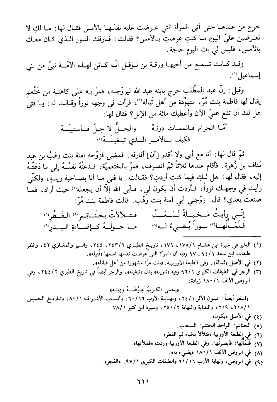 وَقِيلَ: إِنَّ عَبْدَ الْمُطَّلِبِ خَرَجَ بِابْنِهِ عَبْدِ اللَّهِ لِيُزَوِّجَهُ، فَمَرَّ بِهِ عَلَى كَاهِنَةٍ مِنْ خَثْعَمٍ يُقَالُ لَهَا فَاطِمَةُ بِنْتُ مُرٍّ، مُتَهَوِّدَةٍ مِنْ أَهْلِ تَبَالَةَ، فَرَأَتْ فِي وَجْهِهِ نُورًا وَقَالَتْ لَهُ: يَا فَتَى هَلْ لَكَ أَنْ تَقَعَ عَلَيَّ الْآنَ وَأُعْطِيَكَ مِائَةً مِنَ الْإِبِلِ؟ فَقَالَ لَهَا: أَمَّا الْحَرَامُ فَالْمَمَاتُ دُونَهْ وَالْحِلُّ لَا حِلَّ فَأَسْتَبِينَهْ
