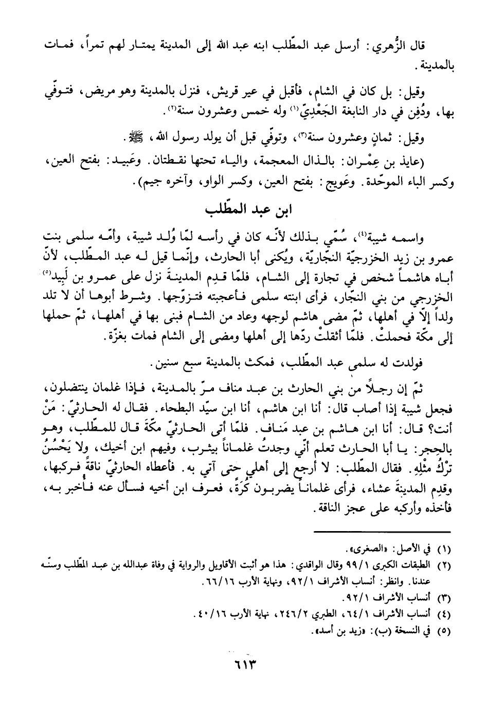 فَوَلَدَتْ لَهُ سَلْمَى عَبْدَ الْمُطَّلِبِ، فَمَكَثَ بِالْمَدِينَةِ سَبْعَ سِنِينَ. ثُمَّ إِنَّ رَجُلًا مِنْ بَنِي الْحَارِثِ بْنِ عَبْدِ مَنَافٍ مَرَّ بِالْمَدِينَةِ فَإِذَا غِلْمَانُ يَنْتَضِلُونَ، فَجَعَلَ شَيْبَةُ إِذَا أَصَابَ قَالَ: أَنَا ابْنُ هَاشِمٍ، أَنَا ابْنُ سَيِّدِ الْبَطْحَاءِ. فَقَالَ لَهُ الْحَارِثِيُّ: مَنْ أَنْتَ؟ قَالَ: أَنَا ابْنُ هَاشِمِ بْنِ عَبْدِ مَنَافٍ. فَلَمَّا أَتَى الْحَارِثِيُّ مَكَّةَ قَالَ لِلْمُطَّلِبِ، وَهُوَ بِالْحِجْرِ: يَا أَبَا الْحَارِثِ تَعْلَمُ أَنِّي وَجَدْتُ غِلْمَانًا بِيَثْرِبَ وَفِيهِمُ ابْنُ أَخِيكَ، وَلَا يَحْسُنُ تَرْكُ مِثْلِهِ. فَقَالَ الْمُطَّلِبُ: لَا أَرْجِعُ إِلَى أَهْلِي حَتَّى آتِيَ بِهِ. فَأَعْطَاهُ الْحَارِثِيُّ نَاقَةً فَرَكِبَهَا، وَقِدَمَ الْمَدِينَةَ عِشَاءً فَرَأَى غِلْمَانًا يَضْرِبُونَ كُرَةً، فَعَرَفَ ابْنَ أَخِيهِ فَسَأَلَ عَنْهُ فَأُخْبِرَ بِهِ، فَأَخَذَهُ وَأَرْكَبَهُ عَلَى عَجُزِ النَّاقَةِ.