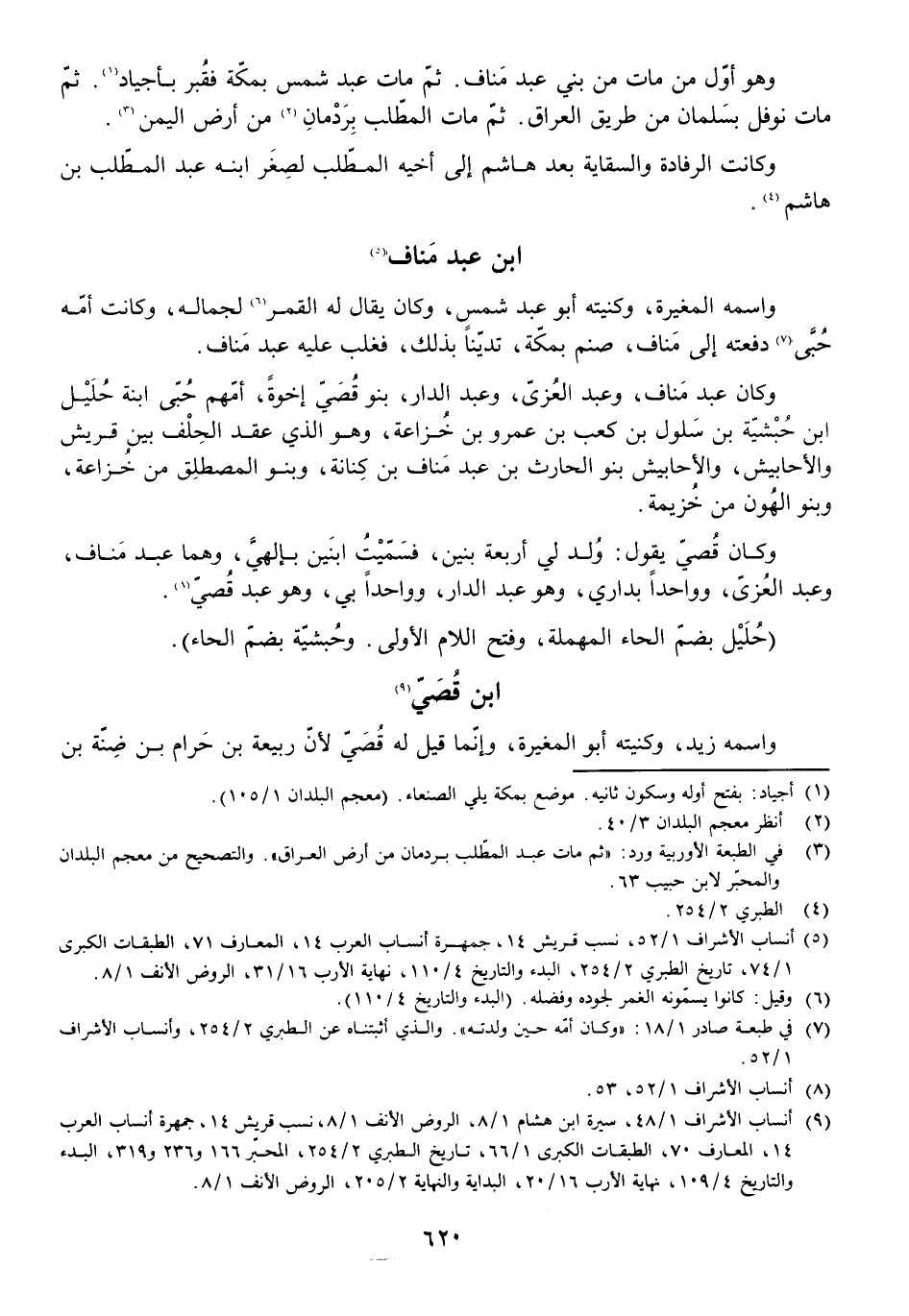 وَهُوَ أَوَّلُ مَنْ مَاتَ مِنْ بَنِي عَبْدِ مَنَافٍ ثُمَّ مَاتَ عَبْدُ شَمْسٍ بِمَكَّةَ فَقُبِرَ بِأَجْيَادَ. ثُمَّ مَاتَ، نَوْفَلٌ بِسَلْمَانَ مِنْ طَرِيقِ الْعِرَاقِ. ثُمَّ مَاتَ الْمُطَّلِبُ بِرَدْمَانَ مِنْ أَرْضِ الْيَمَنِ وَكَانَتِ الرِّفَادَةُ وَالسِّقَايَةُ بَعْدَ هَاشِمٍ إِلَى أَخِيهِ الْمُطَّلِبِ لِصِغَرِ ابْنِهِ عَبْدِ الْمُطَّلِبِ بْنِ هَاشِمٍ.