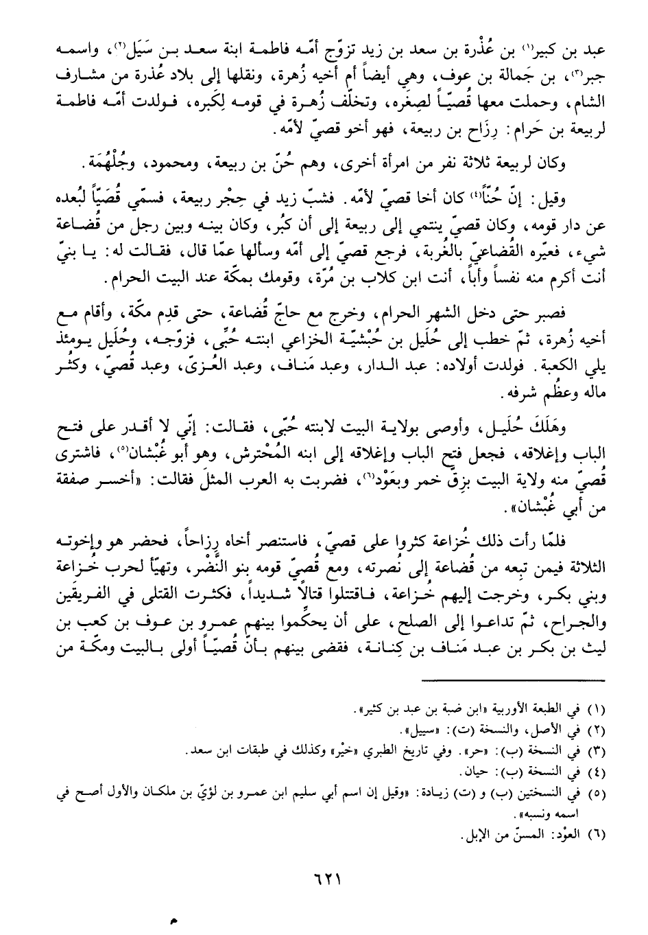 فَلَمَّا رَأَتْ ذَلِكَ خُزَاعَةُ كَثُرُوا عَلَى قُصَيٍّ، فَاسْتَنْصَرَ أَخَاهُ رِزَاحًا، فَحَضَرَ هُوَ وَإِخْوَتُهُ الثَّلَاثَةُ فِيمَنْ تَبِعَهُ مِنْ قُضَاعَةَ إِلَى نُصْرَتِهِ، وَمَعَ قُصَيٍّ قَوْمُهُ بَنُو النَّضْرِ، وَتَهَيَّأَ لِحَرْبِ خُزَاعَةَ وَبَنِي بَكْرٍ، وَخَرَجَتْ إِلَيْهِمْ خُزَاعَةُ فَاقْتَتَلُوا قِتَالًا شَدِيدًا، فَكَثُرَتِ الْقَتْلَى فِي الْفَرِيقَيْنِ وَالْجِرَاحُ، ثُمَّ تَدَاعَوْا إِلَى الصُّلْحِ عَلَى أَنْ يُحَكِّمُوا بَيْنَهُمْ عَمْرَو بْنَ عَوْفِ بْنِ كَعْبِ بْنِ لَيْثِ بْنِ بَكْرِ بْنِ عَبْدِ مَنَافِ بْنِ كِنَانَةَ، فَقَضَى بَيْنَهُمْ بِأَنَّ قُصَيًّا أَوْلَى بِالْبَيْتِ وَمَكَّةَ مِنْ
