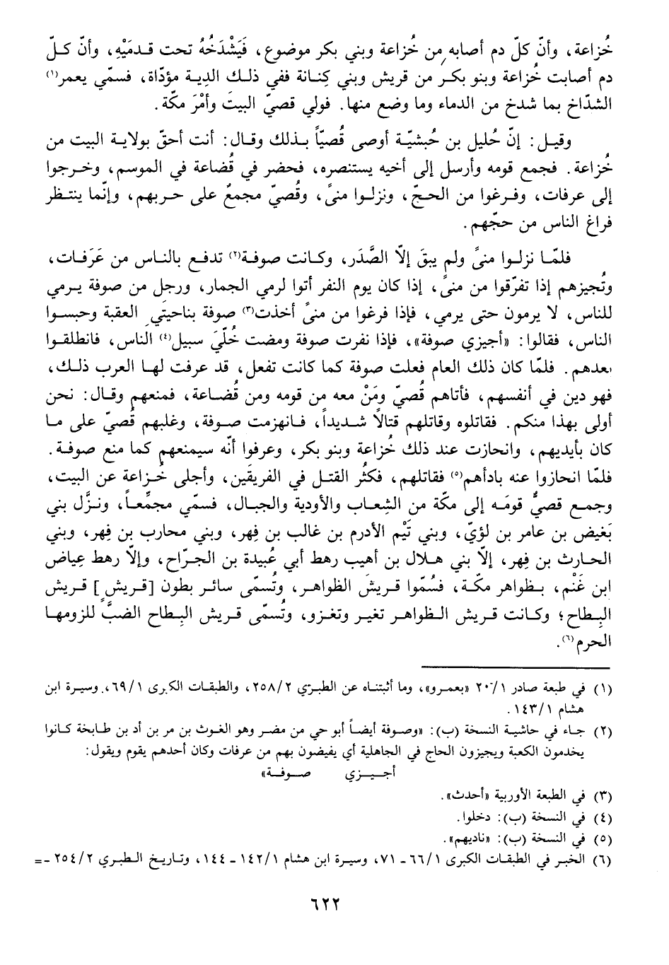 فَلَمَّا نَزَلُوا مِنًى وَلَمْ يَبْقَ إِلَّا الصَّدَرَ، وَكَانَتْ صُوفَةُ تَدْفَعُ بِالنَّاسِ مِنْ عَرَفَاتٍ وَتُجِيزُهُمْ إِذَا تَفَرَّقُوا مِنْ مِنًى، إِذَا كَانَ يَوْمُ النَّفْرِ أَتَوْا لِرَمْيِ الْجِمَارِ، وَرَجُلٌ مِنْ صُوفَةَ يَرْمِي لِلنَّاسِ لَا يَرْمُونَ حَتَّى يَرْمِيَ، فَإِذَا فَرَغُوا مِنْ مِنًى أَخَذَتْ صُوفَةُ بِنَاحِيَتَيِ الْعَقَبَةِ وَحَبَسُوا النَّاسَ، فَقَالُوا: " أَجِيزِي صُوفَةُ "، فَإِذَا نَفَرَتْ صُوفَةُ وَمَضَتْ خُلِّيَ سَبِيلُ النَّاسِ فَانْطَلَقُوا بَعْدَهُمْ. فَلَمَّا كَانَ ذَلِكَ الْعَامُ فَعَلَتْ صُوفَةُ كَمَا كَانَتْ تَفْعَلُ، قَدْ عَرَفَتْ لَهَا الْعَرَبُ ذَلِكَ، فَهُوَ دِينٌ فِي أَنْفُسِهِمْ، فَأَتَاهُمْ قُصَيٌّ وَمَنْ مَعَهُ مِنْ قَوْمِهِ وَمِنْ قُضَاعَةَ فَمَنَعَهُمْ وَقَالَ: نَحْنُ أَوْلَى بِهَذَا مِنْكُمْ. فَقَاتَلُوهُ وَقَاتَلَهُمْ قِتَالًا شَدِيدًا، فَانْهَزَمَتْ صُوفَةُ، وَغَلَبَهُمْ قُصَيٌّ عَلَى مَا كَانَ بِأَيْدِيهِمْ، وَانْحَازَتْ عِنْدَ ذَلِكَ خُزَاعَةُ وَبَنُو بَكْرٍ وَعَرَفُوا أَنَّهُ سَيَمْنَعُهُمْ كَمَا مَنَعَ صُوفَةَ. فَلَمَّا انْحَازُوا عَنْهُ بَادَأَهُمْ فَقَاتَلَهُمْ، فَكَثُرَ الْقَتْلُ فِي الْفَرِيقَيْنِ وَأَجْلَى خُزَاعَةَ عَنِ الْبَيْتِ، وَجَمَعَ قُصَيٌّ قَوْمَهُ إِلَى مَكَّةَ مِنَ الشِّعَابِ وَالْأَوْدِيَةِ وَالْجِبَالِ، فَسُمِّيَ مُجَمِّعًا، وَنَزَّلَ بَنِي بَغِيضِ بْنِ عَامِرِ بْنِ لُؤَيٍّ وَبَنِي تَيْمِ الْأَدْرَمِ بْنِ غَالِبِ بْنِ فِهْرٍ وَبَنِي مُحَارِبِ بْنِ فِهْرٍ وَبَنِي الْحَارِثِ بْنِ فِهْرٍ، إِلَّا بَنِي هِلَالِ بْنِ أُهَيْبٍ رَهْطَ أَبِي عُبَيْدَةَ بْنِ الْجَرَّاحِ وَإِلَّا رَهْطَ عِيَاضِ بْنِ غَنْمٍ، بِظَوَاهِرِ مَكَّةَ، فَسُمُّوا قُرَيْشَ الظَّوَاهِرِ، وَتَسَمَّى سَائِرُ بُطُونِ قُرَيْشٍ قُرَيْشَ الْبِطَاحِ، وَكَانَتْ قُرَيْشُ الظَّوَاهِرِ تُغِيرُ وَتَغْزُو، وَتُسَمَّى قُرَيْشُ الْبِطَاحِ الضَّبَّ لِلُزُومِهَا الْحَرَمَ.