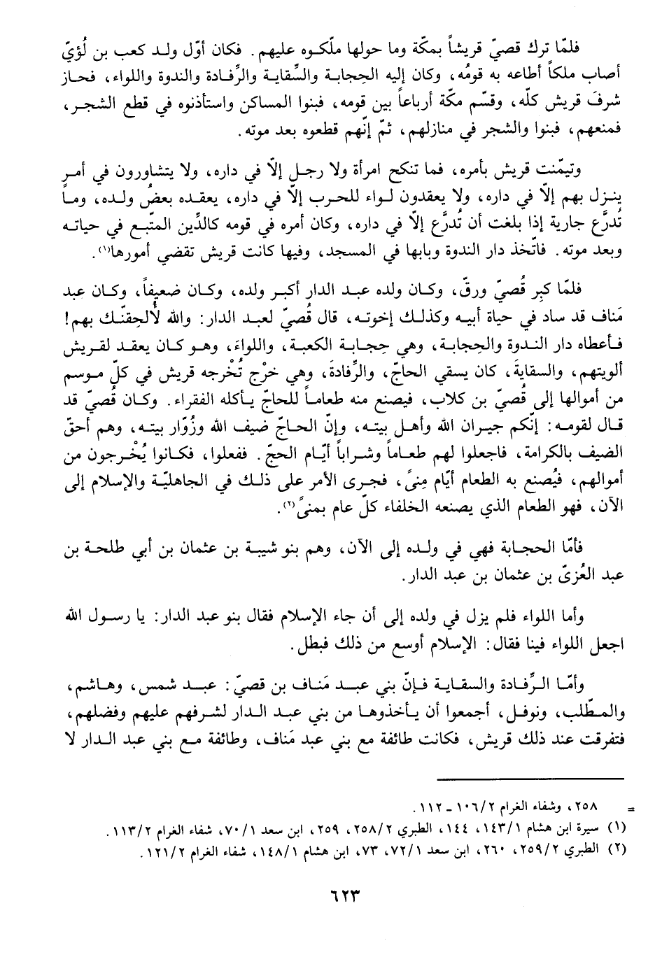 فَلَمَّا كَبِرَ قُصَيٌّ وَرَقَّ، وَكَانَ وَلَدُهُ عَبْدُ الدَّارِ أَكْبَرَ وَلَدِهِ، وَكَانَ ضَعِيفًا، وَكَانَ عَبْدُ مَنَافٍ قَدْ سَادَ فِي حَيَاةِ أَبِيهِ وَكَذَلِكَ إِخْوَتُهُ، قَالَ قُصَيٌّ لِعَبْدِ الدَّارِ: وَاللَّهِ لَأُلْحِقَنَّكَ بِهِمْ! فَأَعْطَاهُ دَارَ النَّدْوَةِ وَالْحِجَابَةَ، وَهِيَ حِجَابَةُ الْكَعْبَةِ، وَاللِّوَاءَ، وَهُوَ كَانَ يَعْقِدُ لِقُرَيْشٍ أَلْوِيَتَهُمْ وَالسِّقَايَةَ، كَانَ يَسْقِي الْحَاجَّ، وَالرِّفَادَةَ، وَهِيَ خَرْجٌ تُخْرِجُهُ قُرَيْشٌ فِي كُلِّ مَوْسِمٍ مِنْ أَمْوَالِهَا إِلَى قُصَيِّ بْنِ كِلَابٍ فَيَصْنَعُ مِنْهُ طَعَامًا لِلْحَاجِّ يَأْكُلُهُ الْفُقَرَاءُ، وَكَانَ قُصَيٌّ قَدْ قَالَ لِقَوْمِهِ: إِنَّكُمْ جِيرَانُ اللَّهِ وَأَهْلُ بَيْتِهِ، وَإِنَّ الْحَاجَّ ضَيْفُ اللَّهِ وَزُوَّارُ بَيْتِهِ، وَهُمْ أَحَقُّ الضَّيْفِ بِالْكَرَامَةِ، فَاجْعَلُوا لَهُمْ طَعَامًا وَشَرَابًا أَيَّامَ الْحَجِّ. فَفَعَلُوا فَكَانُوا يُخْرِجُونَ مِنْ أَمْوَالِهِمْ فَيَصْنَعُ بِهِ الطَّعَامَ أَيَّامَ مِنًى، فَجَرَى الْأَمْرُ عَلَى ذَلِكَ فِي الْجَاهِلِيَّةِ وَالْإِسْلَامِ إِلَى الْآنَ، فَهُوَ الطَّعَامُ الَّذِي يَصْنَعُهُ الْخُلَفَاءُ كُلَّ عَامٍ بِمِنًى.